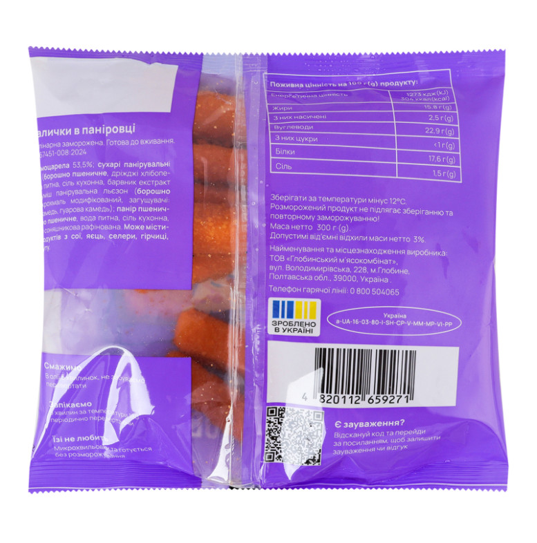 | Склад (укр.) | Сир моцарела 53.5%, сухарі панірувальні помаранчеві (борошно пшеничне, дріжджі хлібопекарські, вода питна, сіль кухонна, барвник екстракт паприки), суміш панірувальна льєзон (борошно пшеничне, крохмаль модифікований, загущувачі: ксантанова камедь, гуарова камедь), панір пшеничний (борошно пшеничне, вода питна, сіль кухонна, дріжджі), олія соняшникова рафінована |