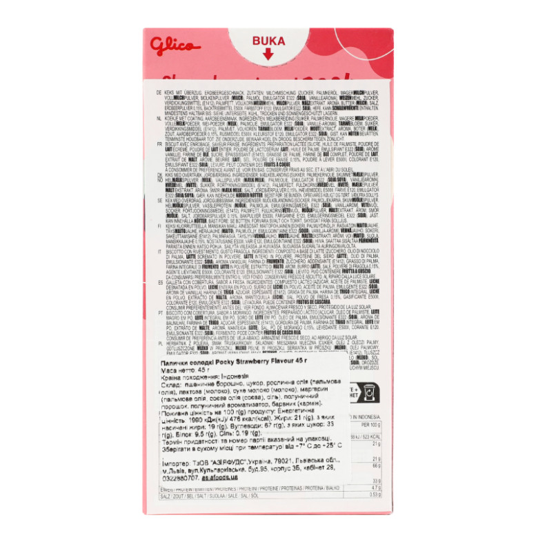 Склад: Пшеничне борошно, цукор, рослинна олія (пальмова олія), лактоза (молоко), сухе молоко (молоко), маргарин (пальмова олія, соєва олія (соя), сіль), полуничний порошок, полуничний ароматизатор, барвник (кармін)
