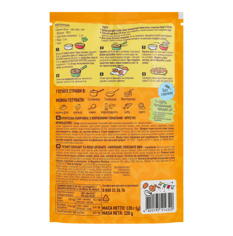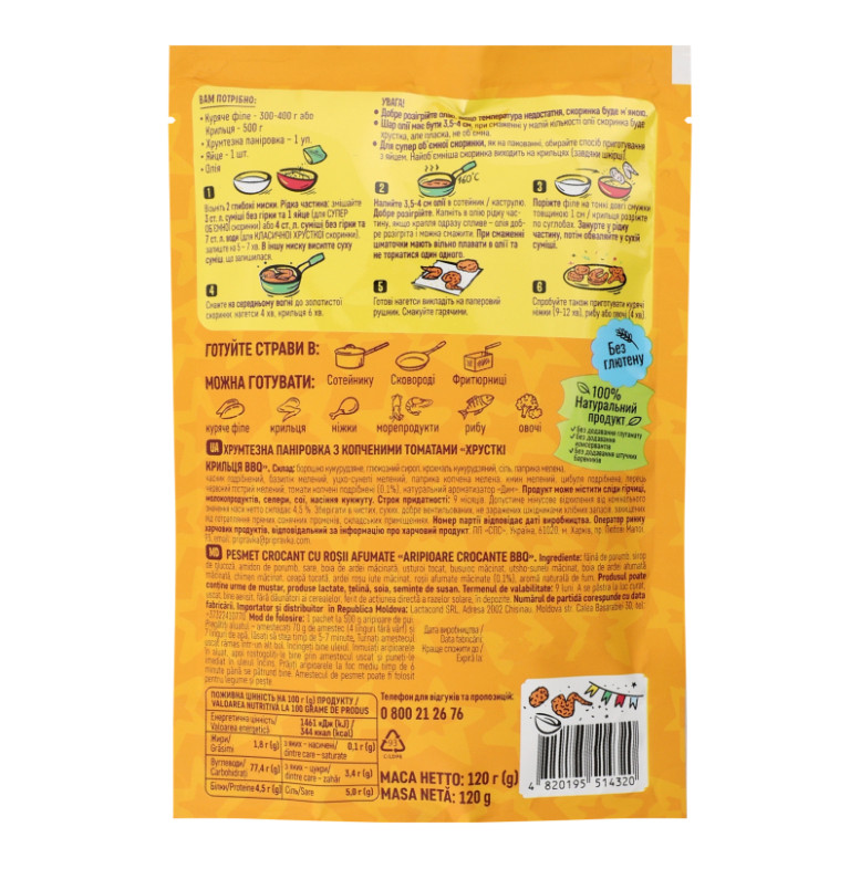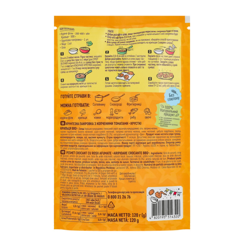 Склад: Борошно кукурудзяне, глюкозний сироп, крохмаль кукурудзяний, сіль, паприка мелена, часник подрібнений, базилік мелений, уцхо-сунелі мелений, паприка копчена мелена, кмин мелений, цибуля подрібнена, перець червоний гострий мелений, томати копчені подрібнені (0.1%), натуральний ароматизатор "Дим"