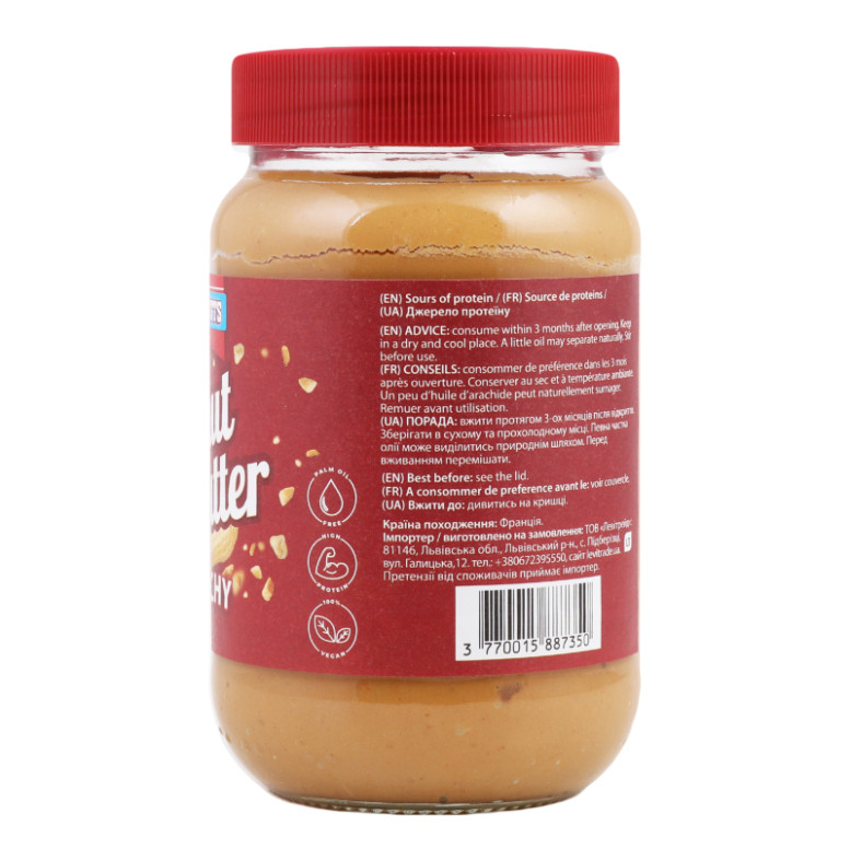 | Склад (укр.) | Смажений арахіс 94.8%, цукор, повністю гідрогенізована рапсова олія, сіль |