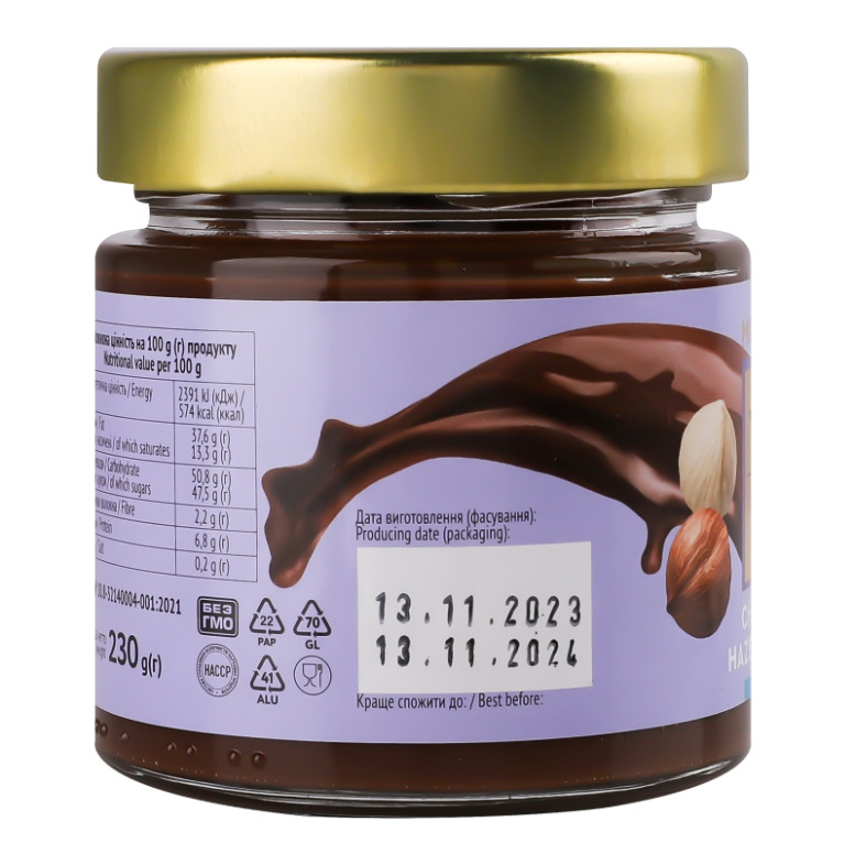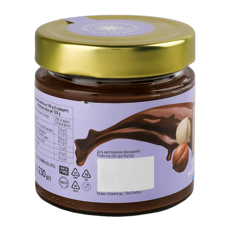 | Склад (укр.) | Цукор, жир рослинний (пальма, соняшник), молоко сухе знежирене, горіх фундук смажений тертий (9%), шоколад молочний (5%) (цукор, какао-масло, молоко сухе незбиране, какао терте, сироватка молочна суха, емульгатор лецитин соєвий, сіль кухонна, ароматизатор ванілін), какао-порошок зі зниженим вмістом жиру (10-12% (5%), емульгатор лецитин соєвий, сіль кухонна |