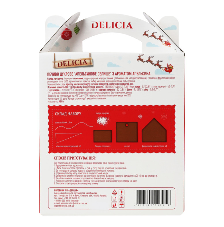 | Склад (укр.) | Борошно пшеничне, пудра цукрова, жир рослинний (пальмова олія негідрогенізована), глюкозно-фруктозний сироп, розпушувач тіста Е500, ароматизатор, прянощі: імбир мелений, коріандр мелений, сіль кухонна |
