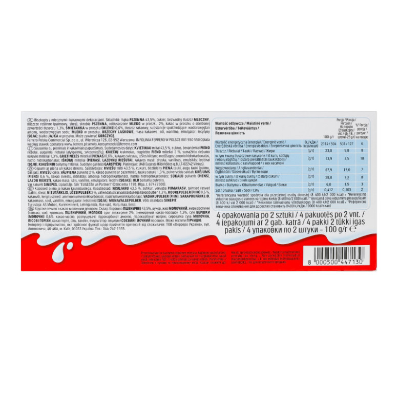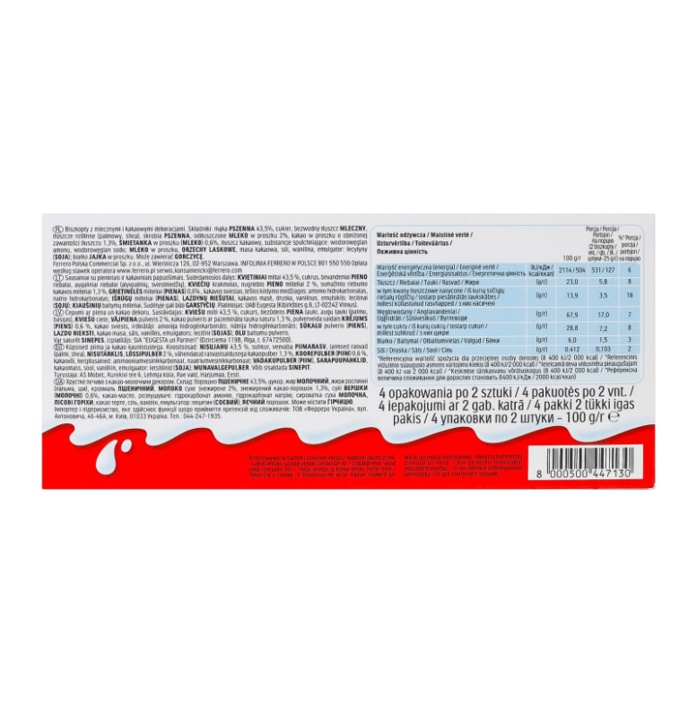 | Склад (укр.) | Борошно пшеничне 43.5%, цукор, жир молочний, жири рослинні (пальма, ши), крохмаль пшеничний, молоко сухе знежирене 2%, знежирений какао-порошок 1.3%, сухі вершки (молочні) 0.6%, какао-масло, розпушувачі: гідрокарбонат амонію, гідрокарбонат натрію, сироватка суха молочна, лісові горіхи, какао терте, сіль, ванілін, емульгатор: лецитин (соєвий), яєчний порошок |