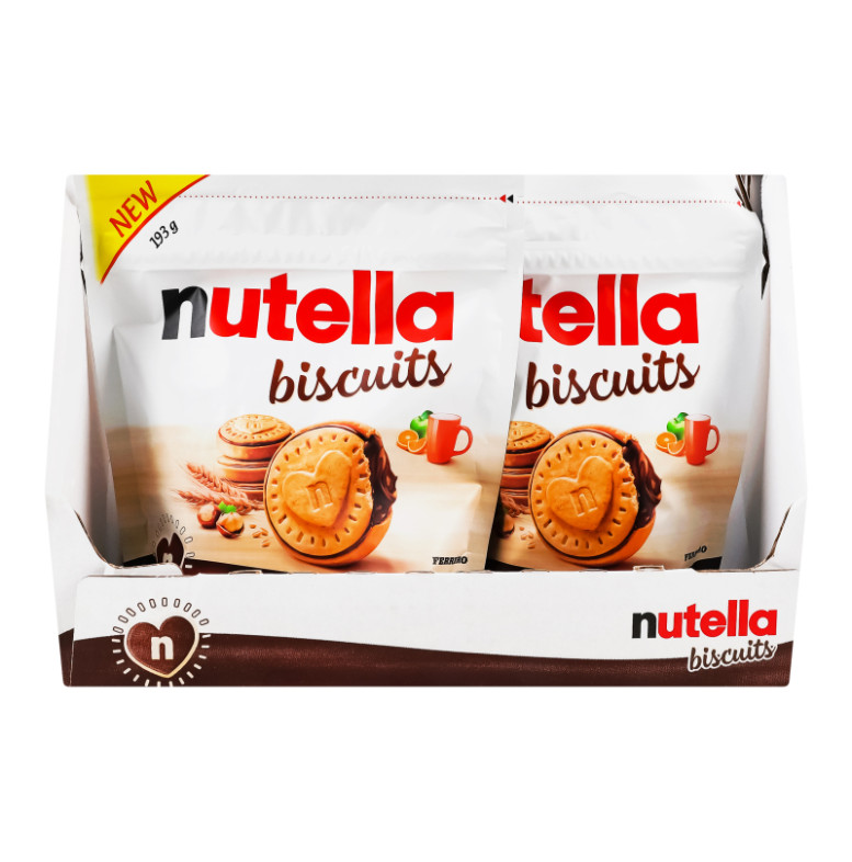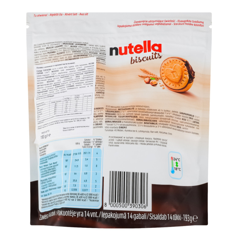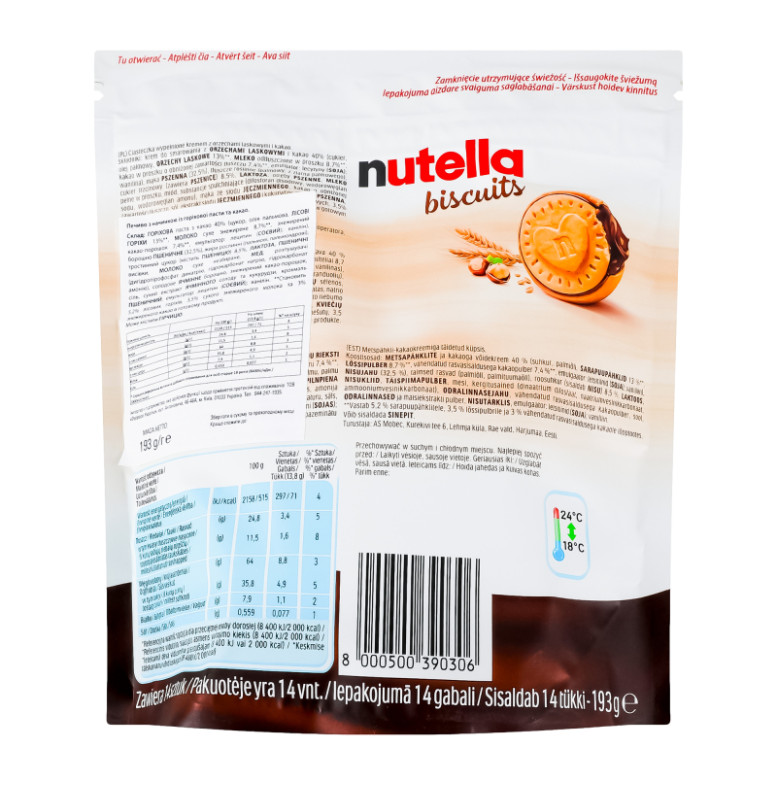 Склад: Горіхова паста з какао 40% (цукор, олія пальмова, лісові горіхи 13%, молоко сухе знежирене 8.7%, знежирений какао-порошок 7.4%, емульгатор: лецитин (соєвий), ванілін), борошно пшеничне (32.5%), жири рослинні (пальмові, пальмоядрові), тростинний цукор (містить пшеницю) 8.5%, лактоза, пшеничні висівки, молоко сухе незбиране, мед, розпушувачі (дигідропірофосфат динатрію, гідрокарбонат натрію, гідрокарбонат амонію), солодове ячмінне борошно, знежирений какао-порошок, сіль, сухий екстракт ячмінного солоду та кукурудзи, крохмаль пшеничний, емульгатор: лецитин (соєвий), ванілін