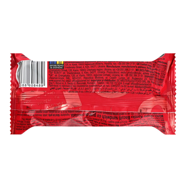 Склад (укр.) | Борошно пшеничне першого сорту, цукор, замінник какао-масла нетемперований лауринового типу (повністю гідрогенізована пальмова олія, емульгатори: Е492, соняшниковий лецитин Е322), олія пальмова рафінована дезодорована, какао зі зниженим вмістом жиру (містить 10-12% какао-масла), жир рослинний негідрогенізований (олія пальмова та її фракції, емульгатор соняшниковий лецитин Е322, антиоксиданти: Е304, Е306), розпушувач карбонат амонію, емульгатори: лецитин соєвий, Е476, розпушувач регулятор кислотності гідрокарбонат натрію, сіль кухонна, сироватка суха молочна, крохмаль кукурудзяний, ароматизатори, шоколадна маса (какао терте, цукор, какао-масло, емульгатор лецитин соєвий, екстракт ванілі) (0.05%), регулятор кислотності кислота лимонна |