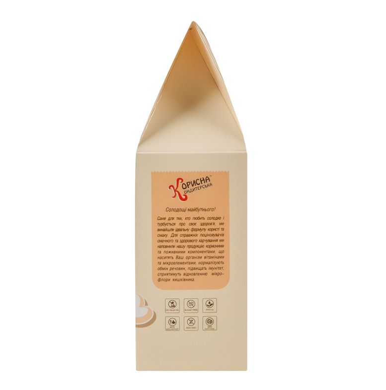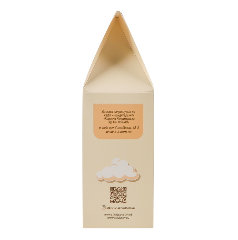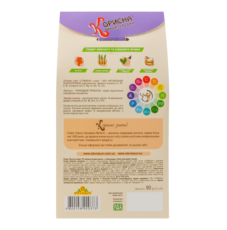 Склад: Борошно пшеничне 1-го гатунку, підсолоджувач (фруктозний сироп, екстракт стевії густий "Стевіясан"), маргарин столовий "молочний 82%", какао-порошок (7.5%), висівки, зародки пшениці, лактитол, чорний шоколад "Стевіясан" (7%) (какао терте, підсолоджувач (фруктоза, екстракт стевії сухий), какао-масло, какао-порошок, соєвий лецитин, ваніль), шоколадна глазур біла (7%) (підсолоджувач (фруктоза, екстракт стевії сухий), какао-масло, соєвий лецитин, ваніль), сода харчова, сіль кухонна, ваніль
