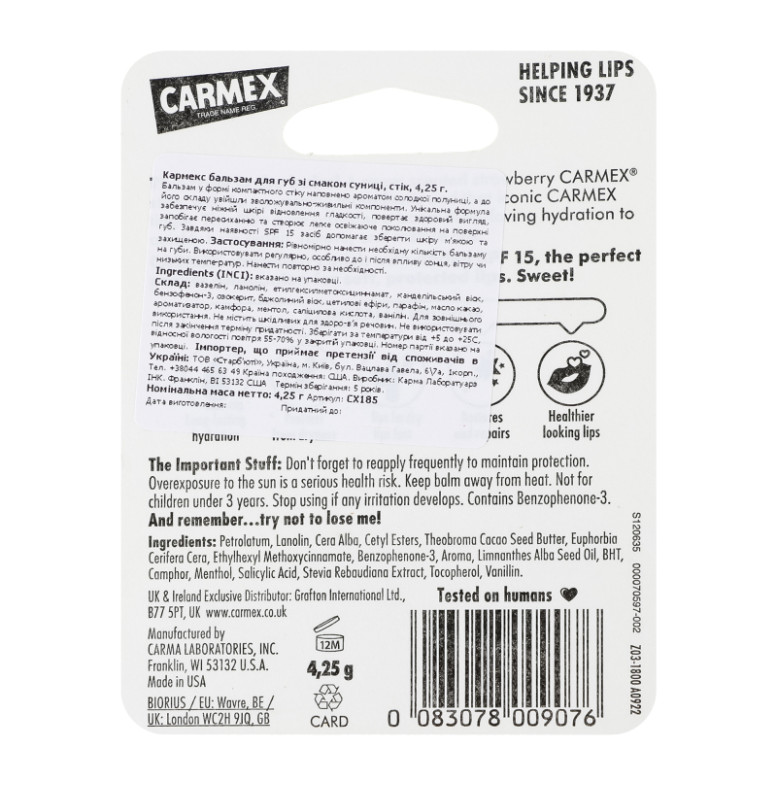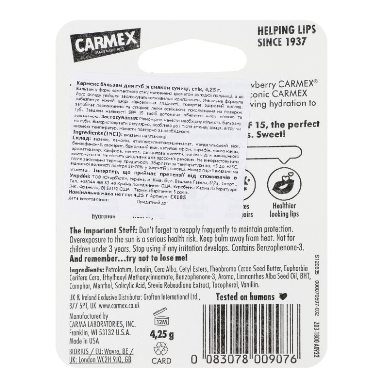 Бальзам для губ зі смаком суниці SPF 15 Carmex 4.25г