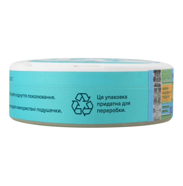 Склад (укр.) | Вода, целюлоза, рослинні волокна, гліцерин, хлорид натрію (сіль харчова), нікотин, ароматизатори, моно- та дигліцериди жирних кислот, винна кислота, карбонат натрію, ацесульфам калію (підсолоджувач), хлорид кальцію, ефірні олії м'яти та перцевої м'яти |