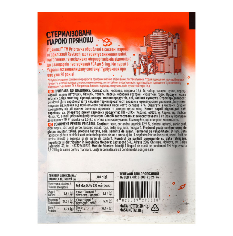 Склад: Сіль, коріандр, паприка 12.9%, чабер, часник, цукор, перець чорний, зелень петрушки, базилік, томати, перець червоний гострий, мускатний горіх
