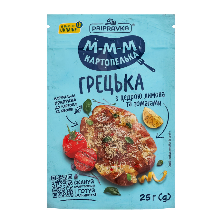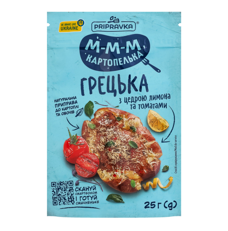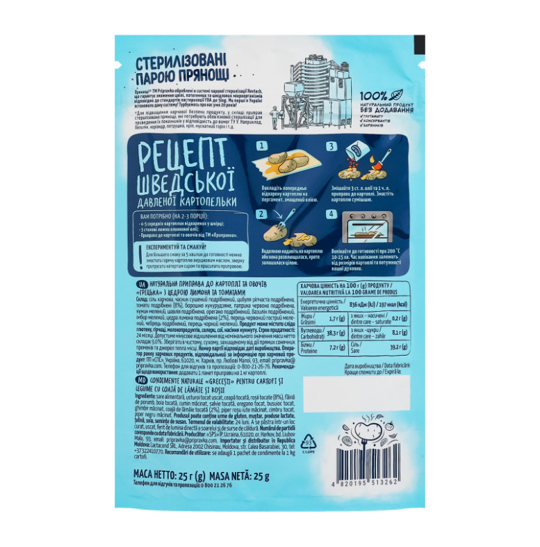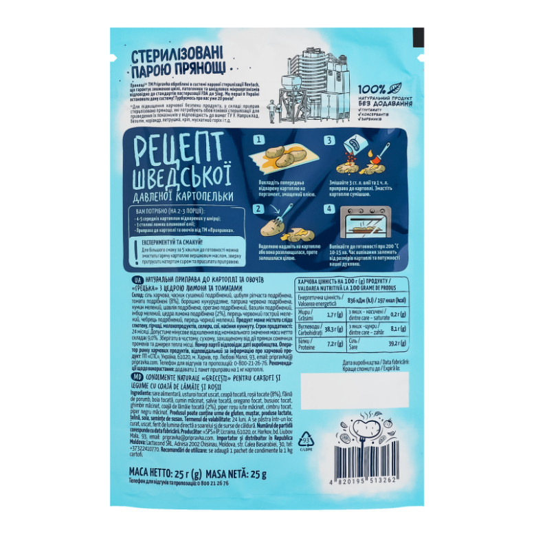 Склад: Сіль харчова, часник сушений подрібнений, цибуля ріпчаста подрібнена, томати подрібнені (8%), борошно кукурудзяне, паприка червона подрібнена, кумин мелений, шавлія подрібнена, орегано подрібнений, базилік подрібнений, імбир мелений, цедра лимона подрібнена (2%), перець червоний гострий мелений, чебрець подрібнений, перець чорний мелений