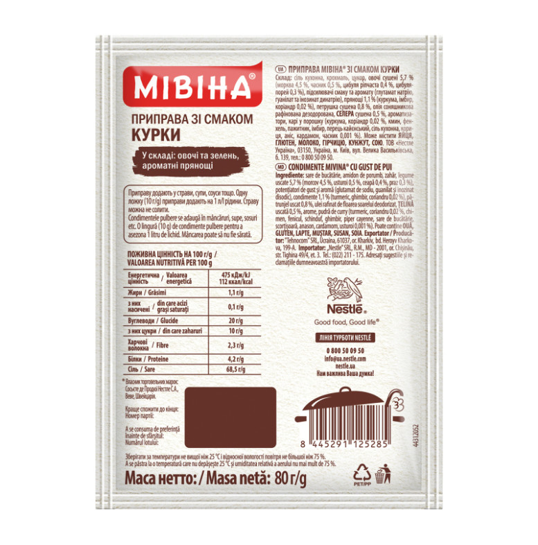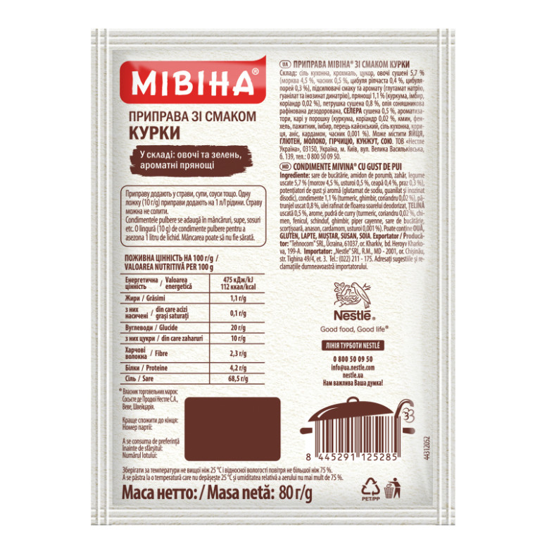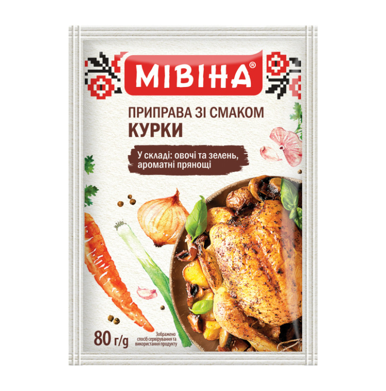 | Склад (укр.) | Сіль кухонна, крохмаль, цукор, овочі сушені 5.7% (морква 4.5%, часник 0.5%, цибуля ріпчаста 0.4%, цибуля-порей 0.3%), підсилювачі смаку та аромату (глутамат натрію, гуанілат та інозинат динатрію), прянощі 1.1% (куркума, імбир, коріандр 0.02%), петрушка сушена 0.8%, олія соняшникова рафінована дезодорована, селера сушена 0.5%, ароматизатори, карі у порошку (куркума, коріандр 0.02%, кмин, фенхель, пажитник, імбир, перець кайєнський, сіль кухонна, кориця, аніс, кардамон, часник 0.001%) |
