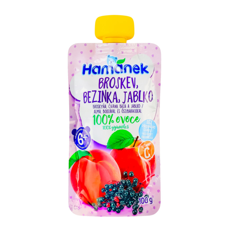 Пюре фруктово-ягідне для дітей від 6міс гомогенізоване Яблуко з персиком та бузиною Hamanek д/п 100г