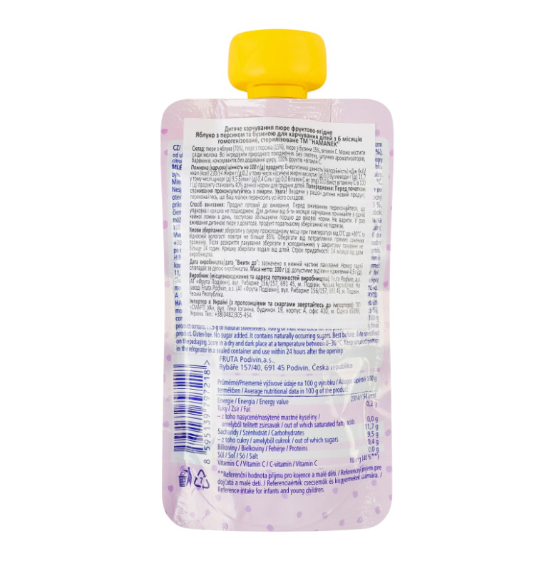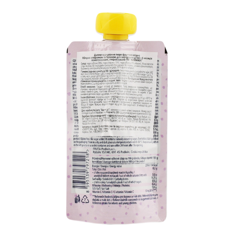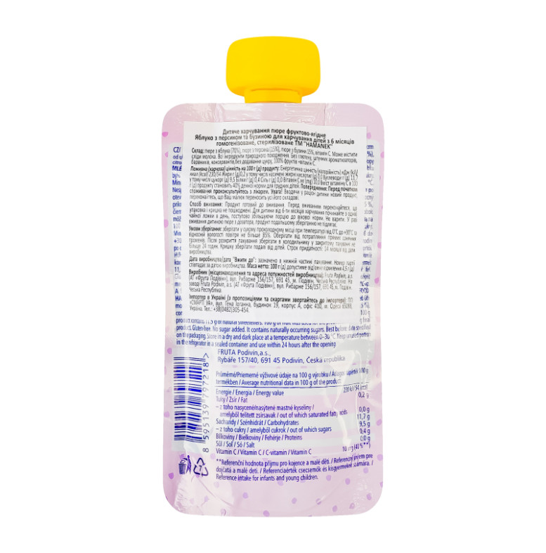Склад: Пюре з яблука (70%), пюре з персика (15%), пюре з бузини 15%, вітамін С