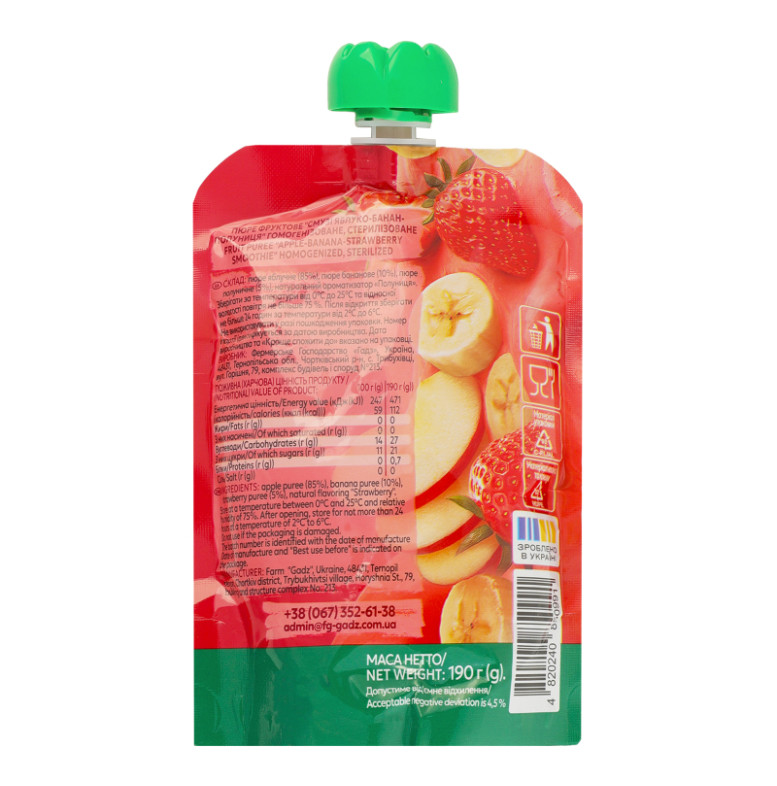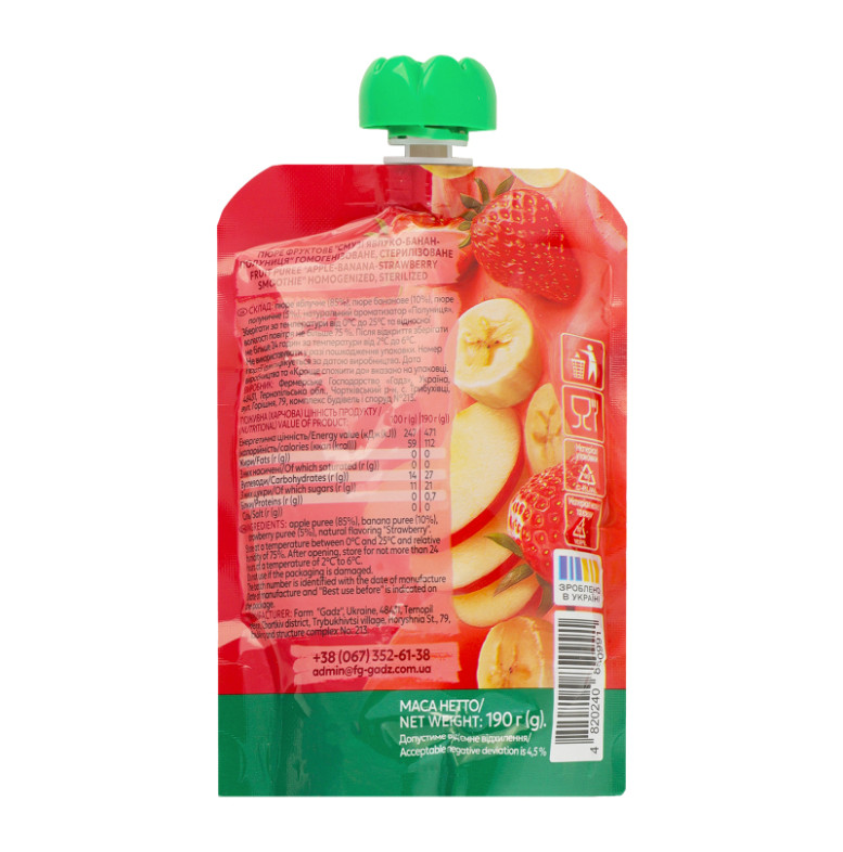 Склад: Пюре яблучне (85%), пюре бананове (10%), пюре полуничне (5%), натуральний ароматизатор "Полуниця"