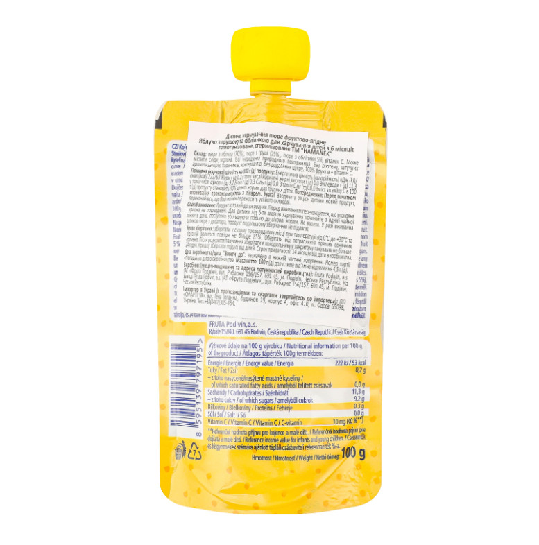 Склад: Пюре з яблука (70%), пюре з груші (25%), пюре з обліпихи 5%, вітамін С
