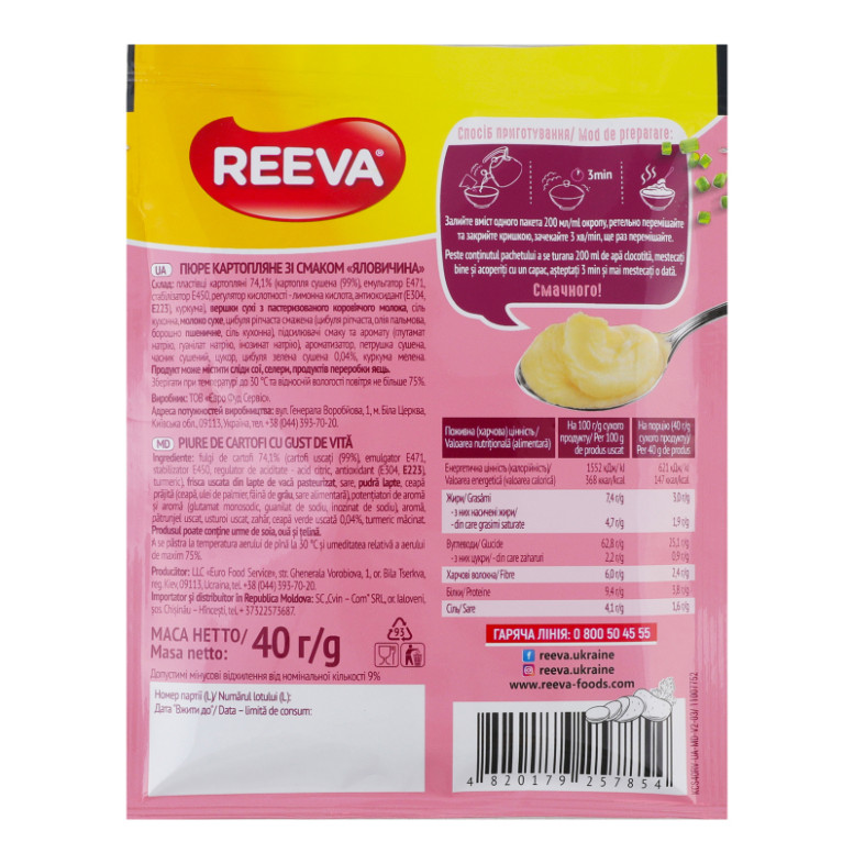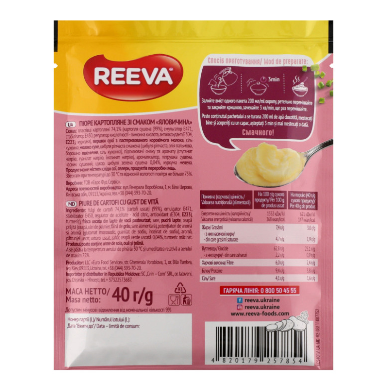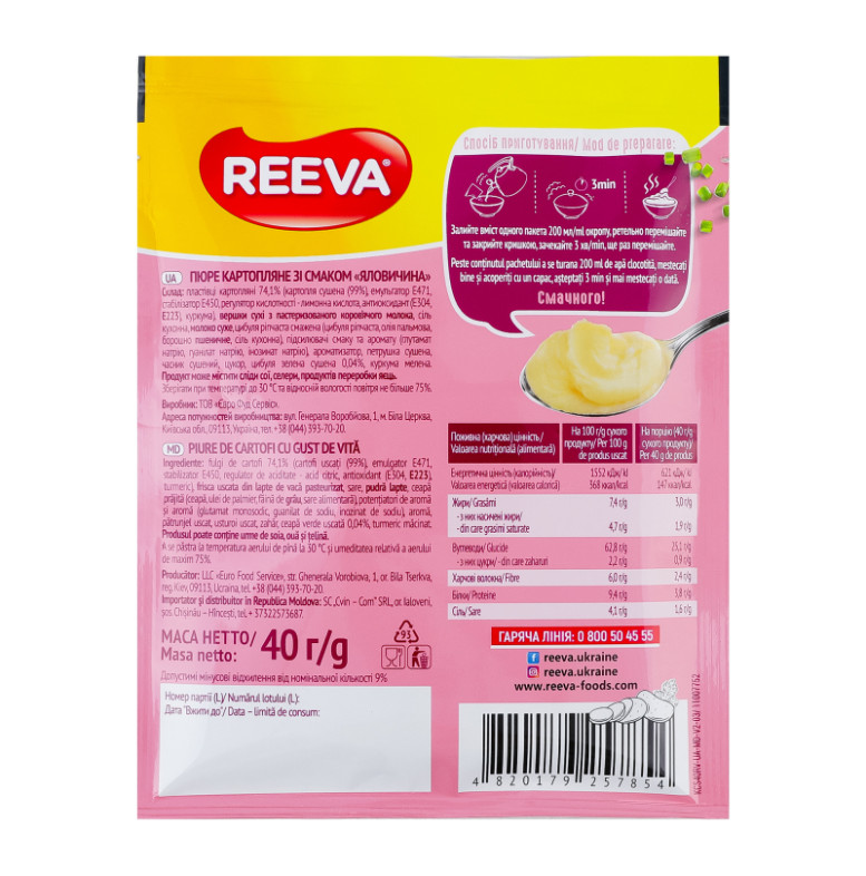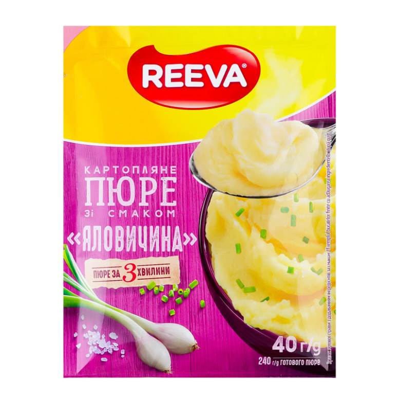 Склад: Пластівці картопляні 74.1% (картопля сушена (99%), емульгатор Е471, стабілізатор Е450, регулятор кислотності - лимонна кислота, антиоксидант (Е304, Е223), куркума), вершки сухі з пастеризованого коров'ячого молока, сіль кухонна, молоко сухе, цибуля ріпчаста смажена (цибуля ріпчаста, олія пальмова, борошно пшеничне, сіль кухонна), підсилювачі смаку та аромату (глутамат натрію, гуанілат натрію, інозинат натрію), ароматизатор, петрушка сушена, часник сушений, цукор, цибуля зелена сушена 0.04%, куркума мелена