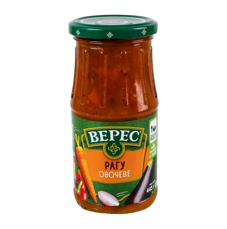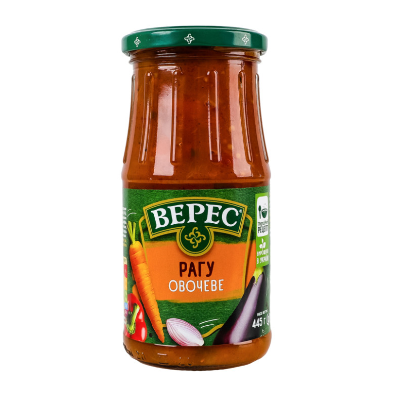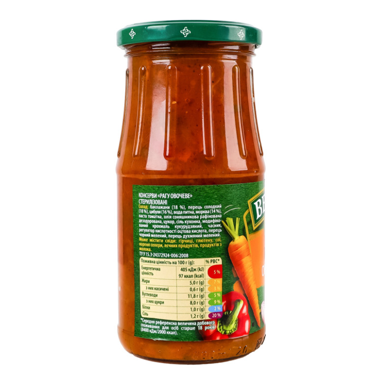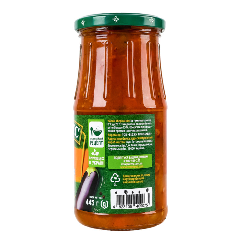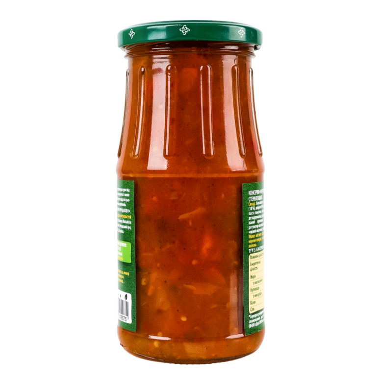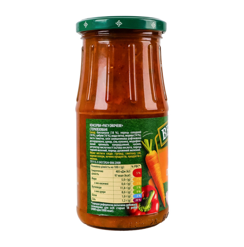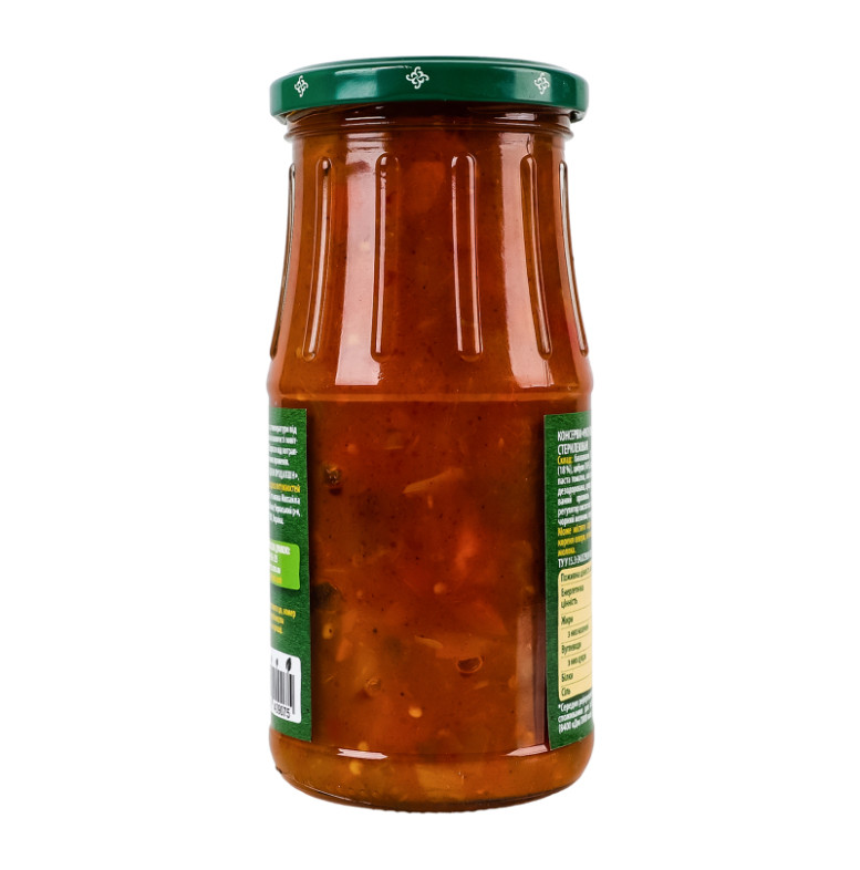 | Склад (укр.) | Баклажани (18%), перець солодкий (18%), цибуля (16%), вода питна, морква (14%), паста томатна, олія соняшникова рафінована дезодорована, цукор, сіль кухонна, модифікований крохмаль кукурудзяний, часник, регулятор кислотності оцтова кислота, перець чорний мелений, перець духмяний мелений |
