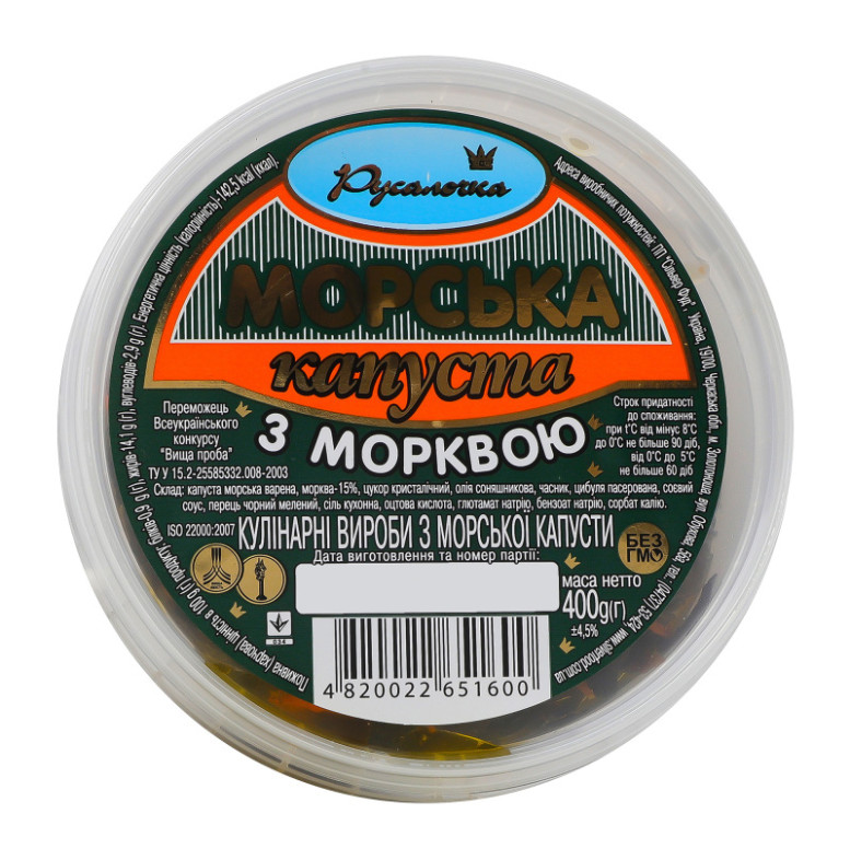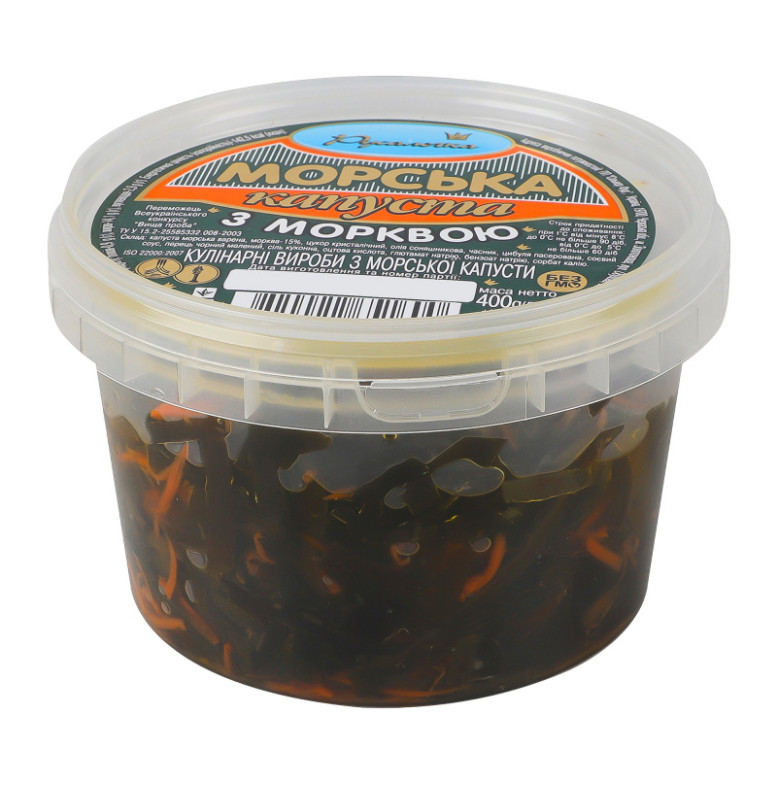 | Склад (укр.) | Капуста морська варена, морква - 15%, цукор кристалічний, олія соняшникова, часник, цибуля пасерована, соєвий соус, перець чорний мелений, сіль кухонна, оцтова кислота, глутамат натрію, бензоат натрію, сорбат калію |
