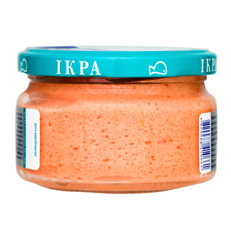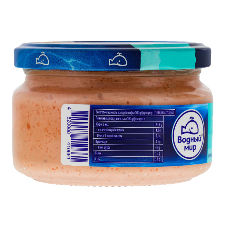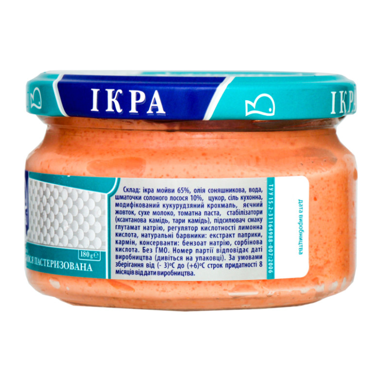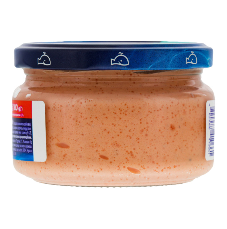 Склад (укр.)Олія соняшникова рафінована дезодорована, вода питна, ікра оселедця (в) або ікра мойви (с) 30%, м'ясо лосося солоне подрібнене 12%, цукор, сіль кухонна, крохмаль кукурудзяний модифікований, яєчний жовток, молоко сухе знежирене, томатна паста, стабілізатори: ксантанова камедь, камедь тари, підсилювач смаку та аромату Е621, регулятор кислотності лимонна кислота, натуральні барвники: екстракт паприки, кармін, консерванти: Е202, Е211