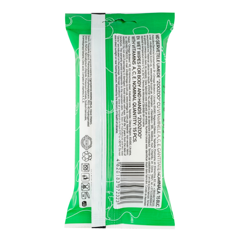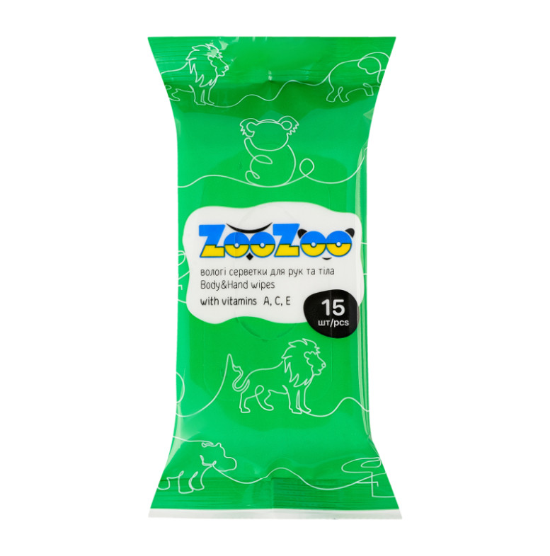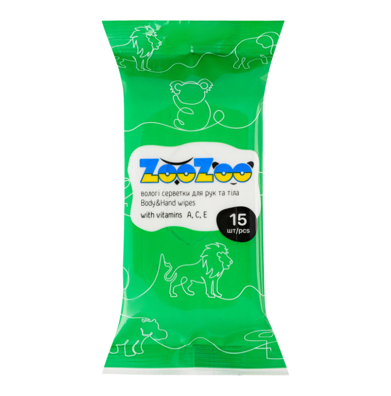 Серветки вологі для рук та тіла з вітамінами А, С, Е ZooZoo 15шт