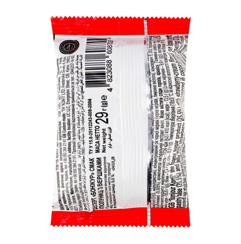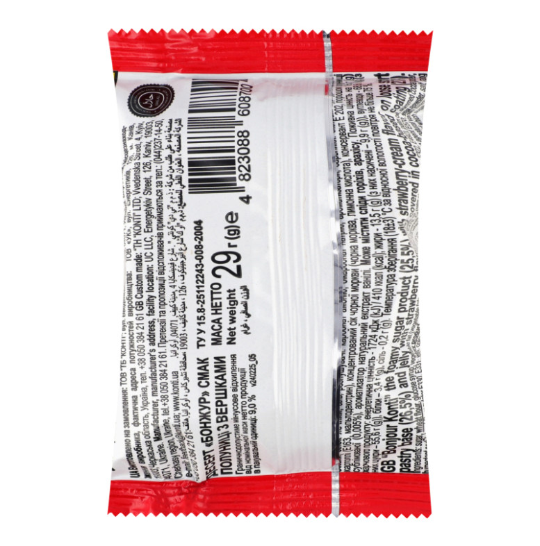 | Склад (укр.) | Цукор, патока крохмальна кукурудзяна, борошно пшеничне першого сорту, жир рослинний повністю гідрогенізований (олія пальмова та її фракції, емульгатори Е492, соняшниковий лецитин Е322), какао зі зниженим вмістом жиру (містить 10-12% какао-масла), олія пальмова рафінована дезодорована, стабілізатор вологості сорбітол, регулятори кислотності: кислота лимонна, цитрат натрію, сироватка суха молочна, драглеутворювач пектин, емульгатори: "Квік 96" (вода питна, цукор, емульгатори: Е471, Е475, піногасник Е570, стабілізатор вологості Е1520, Е476), Е476, лецитин соєвий, білок яєчний, сіль, розпушувачі: карбонат амонію, бікарбонат натрію, ароматизатори, барвники: екстракт пурпурної солодкої картоплі (Е163, мальтодекстрин), концентрований сік чорної моркви (чорна морква, лимонна кислота), консервант Е202, порошок полуниці сублімованої (0.005%), ароматизатор натуральний екстракт ванілі |