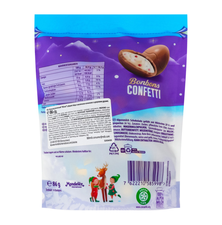 | Склад (укр.) | Цукор, жири рослинні (олія пальмова і кокосова), какао-масло, молоко сухе знежирене, сироватка суха молочна, какао терте, жир молочний, пшеничний крохмаль, емульгатор (лецитин соєвий), паста горіхова (фундук), сироп глюкозний, сік буряковий концентрований, барвник (Е163), глазур (віск бджолиний), ароматизатор |