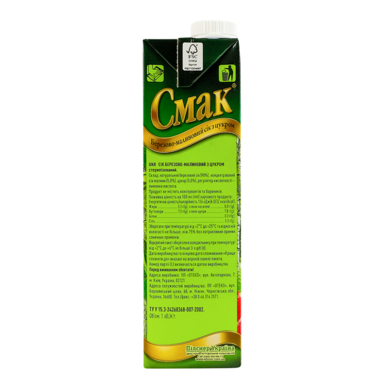Сік стерилізований з цукром березово-малиновий Смак т/п 1л