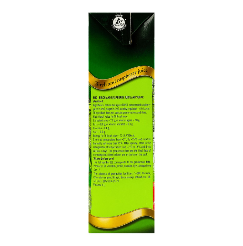 Склад: Натуральний березовий сік (90%), концентрований сік малини (5%), цукор (5%), регулятор кислотності - лимонна кислота