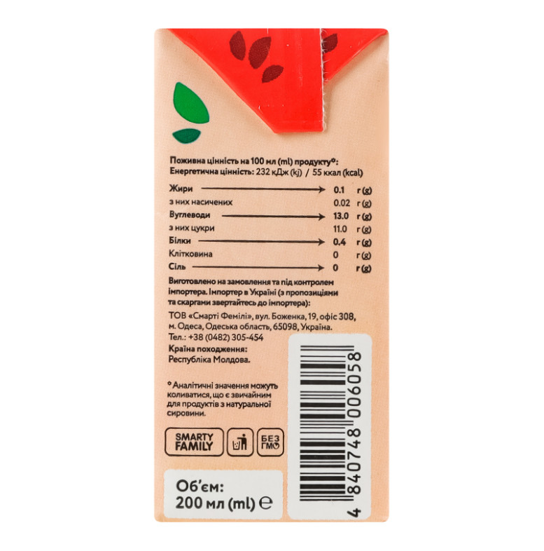 | Калорійність, кДж/100мл | 232 |