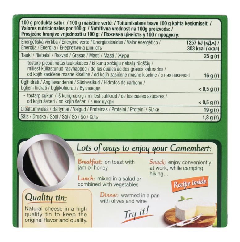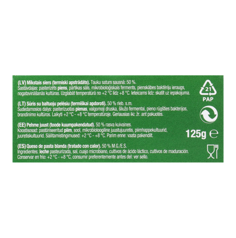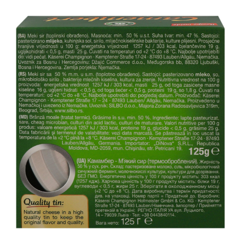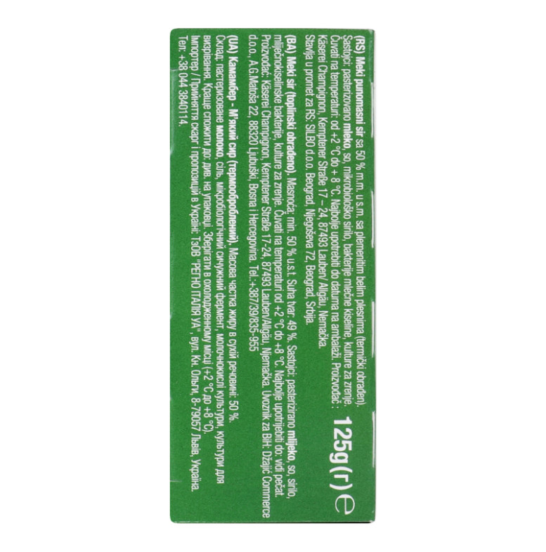 Склад (укр.): Пастеризоване молоко, сіль, мікробіологічний сичужний фермент, молочнокислі культури, культури для визрівання