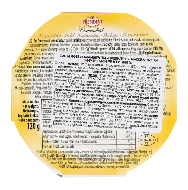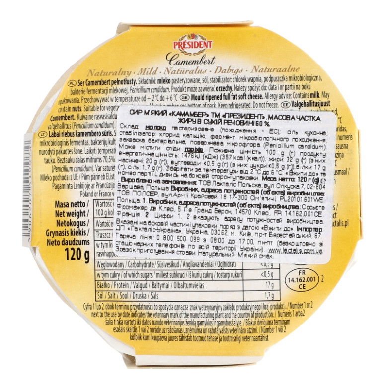 Склад: Молоко пастеризоване (походження - ЄС), сіль кухонна, стабілізатор: хлорид кальцію, фермент мікробіологічного походження, закваска бактеріальна, поверхнева мікрофлора (penicillum candidum)