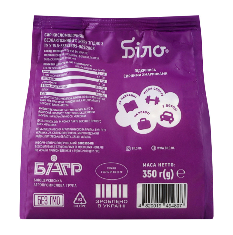 Сир кисломолочний 5% безлактозний Біло м/у 350г