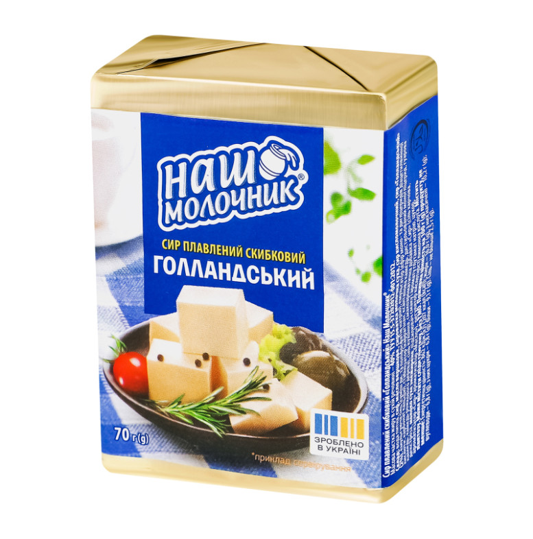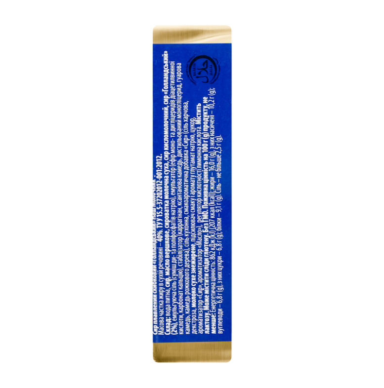 Склад: Вода питна, сир, масло вершкове, сироватка молочна суха, сир кисломолочний, сир "Голландський" (2%), емульгуюча сiль (сумiш ди- та поліфосфатів натрію), емульгатор (ефір моно- та дигліцеридів діацетилвинної кислоти, карбонат кальцію), стабілізатор (каррагінан, ксантанова камедь, дистильований моногліцерид, гуарова камедь, камедь ріжкового дерева), сіль кухонна, смако-ароматична добавка "Сир" (сіль харчова, декстроза, молоко сухе знежирене, підсилювач смаку та аромату глутамат натрію, цукор, ароматизатор "Сир", ароматизатор "Масло"), регулятор кислотностi лимонна кислота