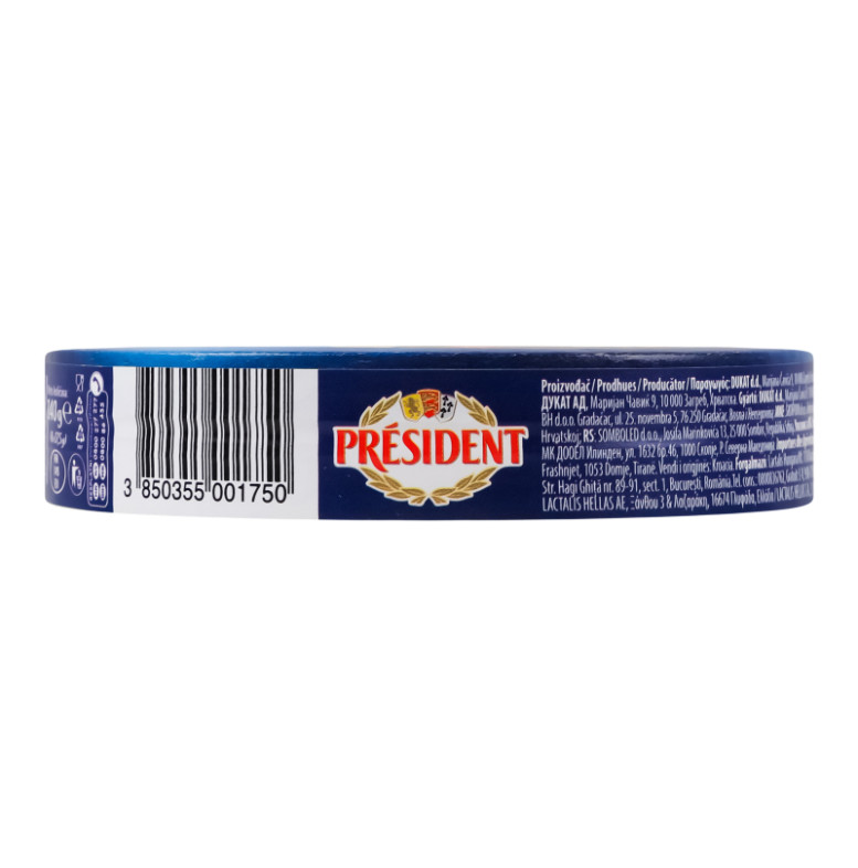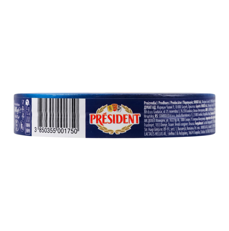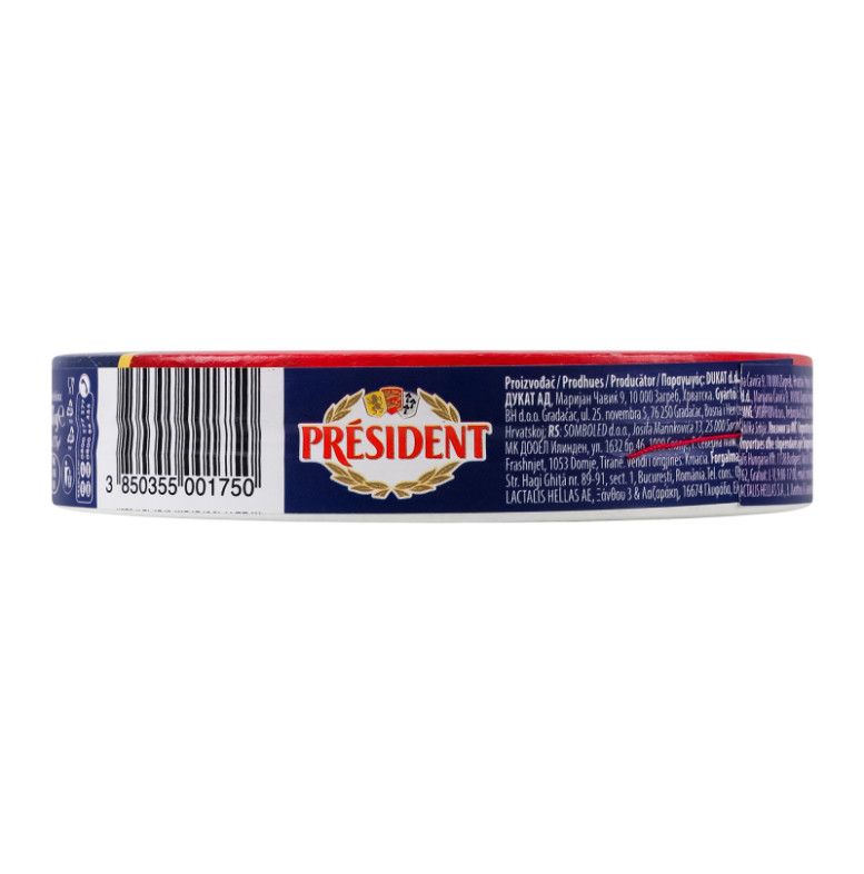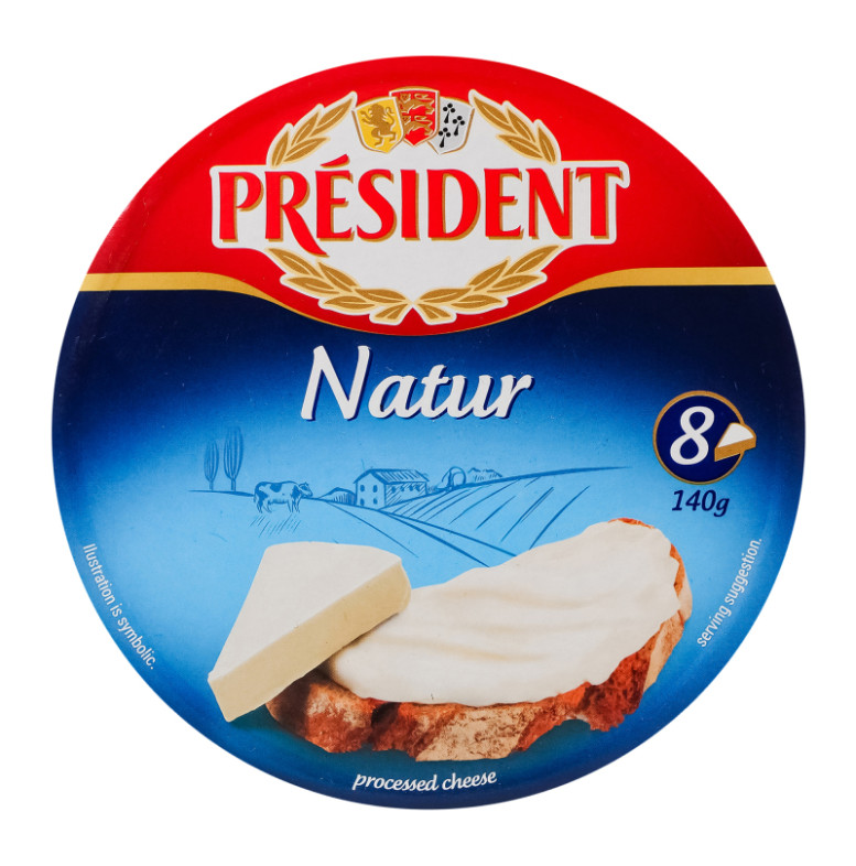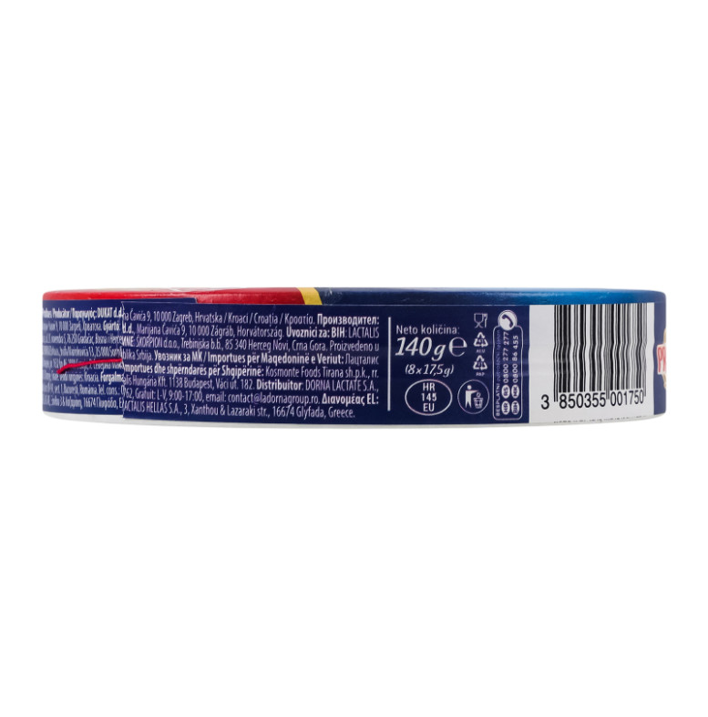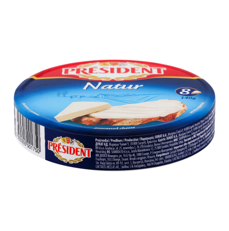 Склад: Сир твердий, сир напівтвердий (54%) (молоко пастеризоване, сіль кухонна, стабілізатор: хлорид кальцію, закваска бактеріальна, сичужний фермент, барвник: аннато, консервант: лізоцим (містить яйце)), вода питна, масло, сироватка суха, сир свіжий, молоко знежирене сухе, солі-плавителі: E452, E450, E339; консервант: нізин