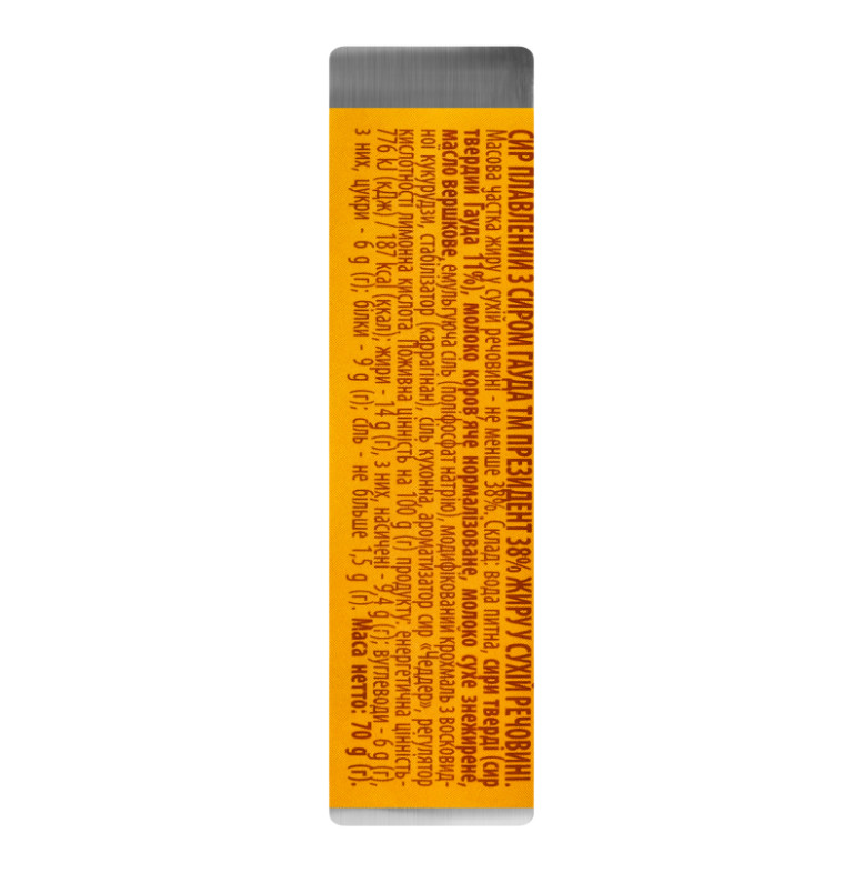 Склад (укр.) | Вода питна, сири тверді (сир твердий Гауда 11%), молоко коров'яче нормалізоване, молоко сухе знежирене, масло вершкове, емульгуюча сіль (поліфосфат натрію), модифікований крохмаль з восковидної кукурудзи, стабілізатор (каррагінан), сіль кухонна, ароматизатор сир "Чеддер", регулятор кислотності лимонна кислота |
