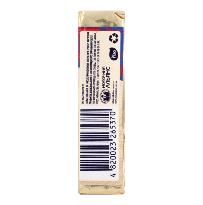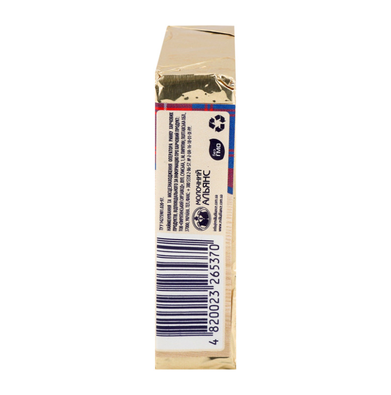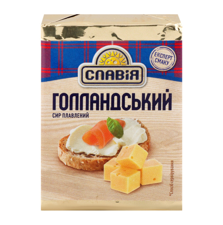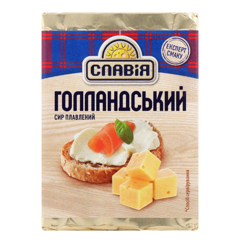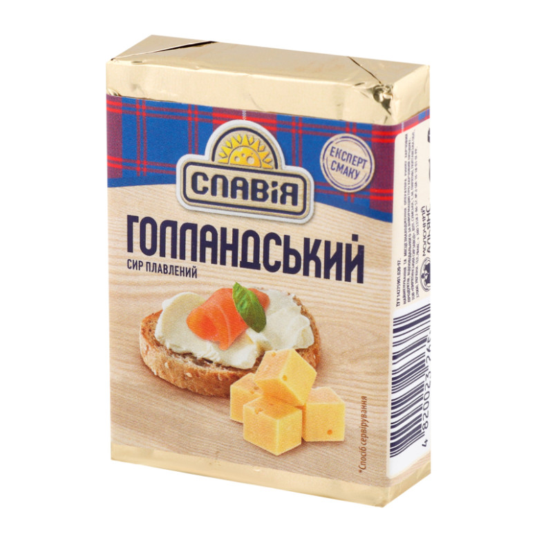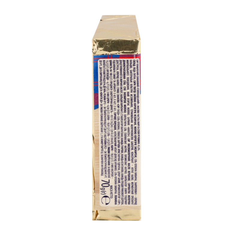 Склад: Вода питна, сири тверді (молоко коров'яче незбиране, молоко коров'яче знежирене, сіль кухонна виварна, закріплювач - хлорид кальцію, бактеріальні культури мезофільних, термофільних молочнокислих бактерій, консервант - нітрат калію, ферментний препарат мікробіального походження, який згортає молоко, барвник "Аннато"), сир кисломолочний, масло вершкове, сироватка молочна демінералізована суха, сухе знежирене молоко, емульгуюча сіль (поліфосфат натрію, пірофосфат натрію), емульгатор (ефіри гліцерину діацетилвинної та жирних кислот, кальцію карбонат), стабілізатор (карагенан, камедь гуарова, камедь ксантанова, камедь плодів ріжкового дерева, декстроза, хлорид калію), суміш смакова "Сир Гауда" (сіль кухонна, глюкоза харчова кристалічна гідратна, цукор білий, ароматизатор "Сир", підсилювачі смаку та аромату: Е621, Е627, Е631, сирний порошок, антиспікаючий агент - діоксид кремнію), сіль кухонна виварна
