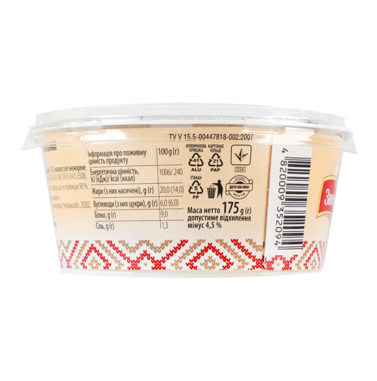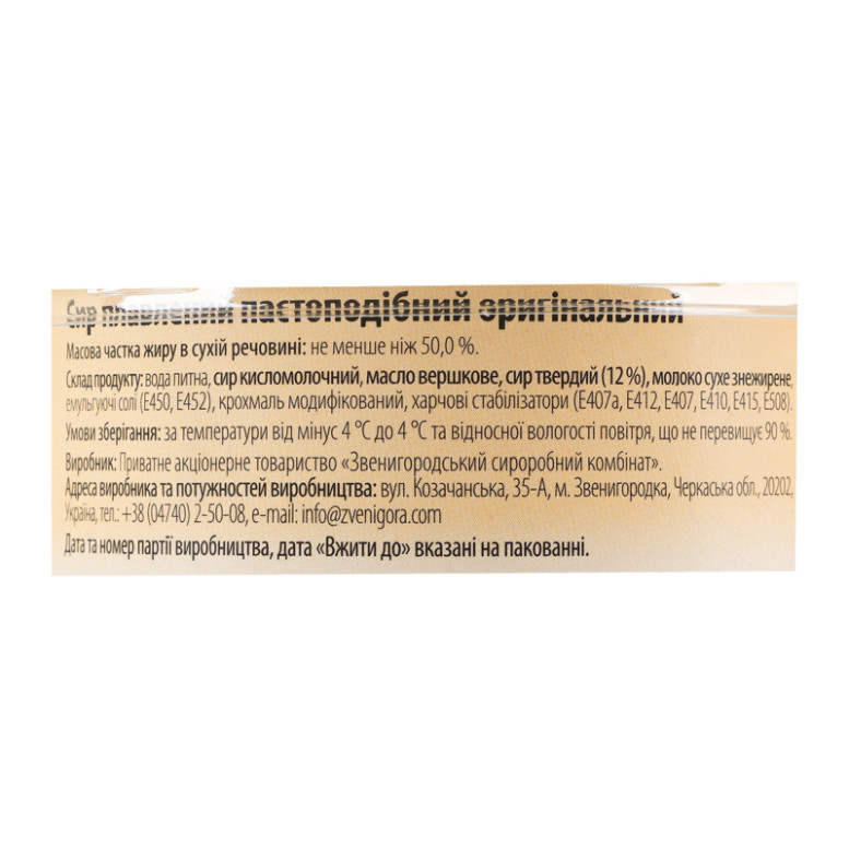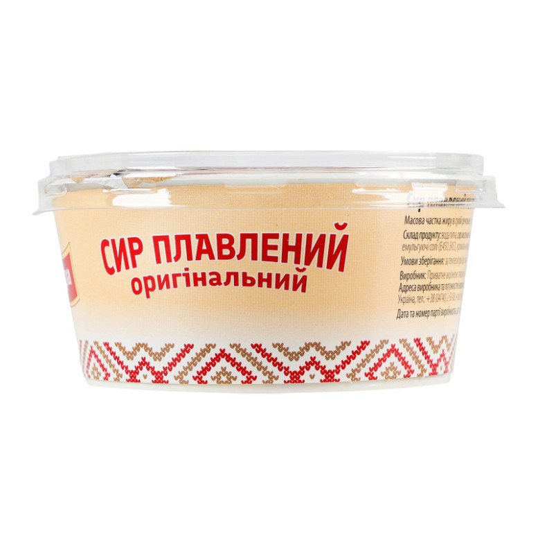 | Склад (укр.) | Вода питна, сир кисломолочний, масло вершкове, сир твердий (12%), молоко сухе знежирене, емульгуючі солі (Е450, Е452), крохмаль модифікований, харчові стабілізатори (Е407а, Е412, Е407, Е410, Е415, Е508) |
