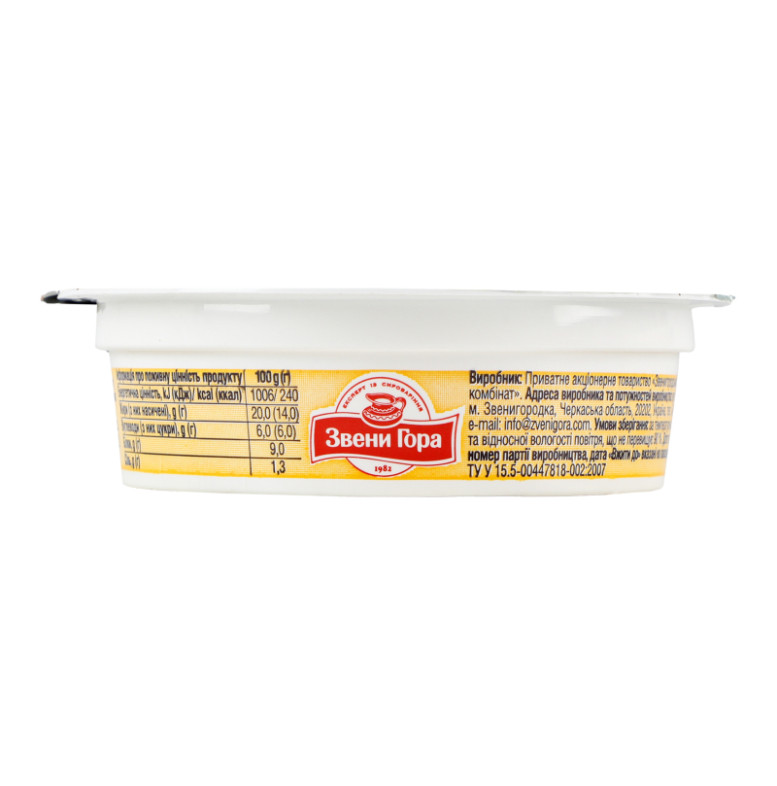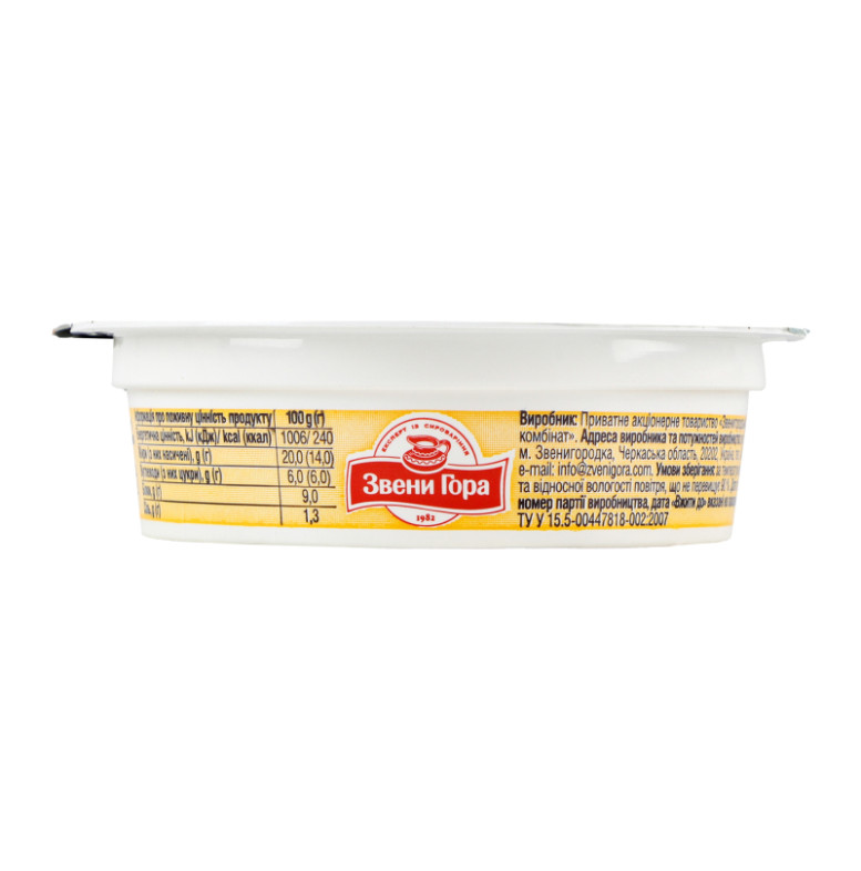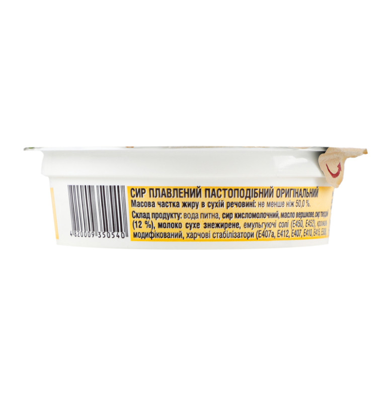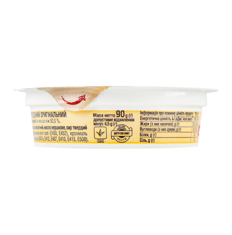 | Склад (укр.) | Вода питна, сир кисломолочний, масло вершкове, сир твердий (12%), молоко сухе знежирене, емульгуючі солі (Е450, Е452), крохмаль модифікований, харчові стабілізатори: (Е407а, Е412, Е407, Е410, Е415, Е508) |