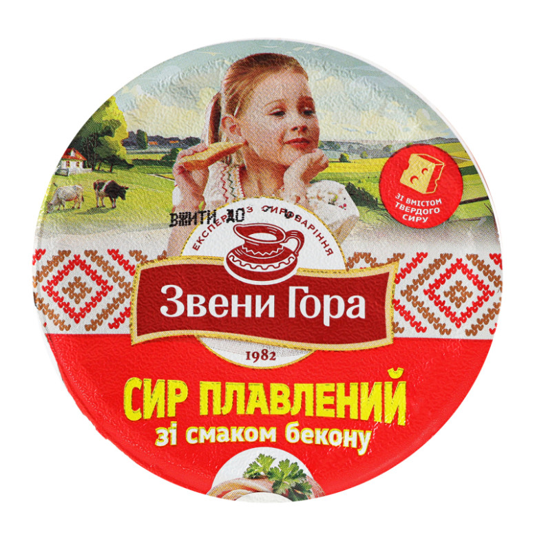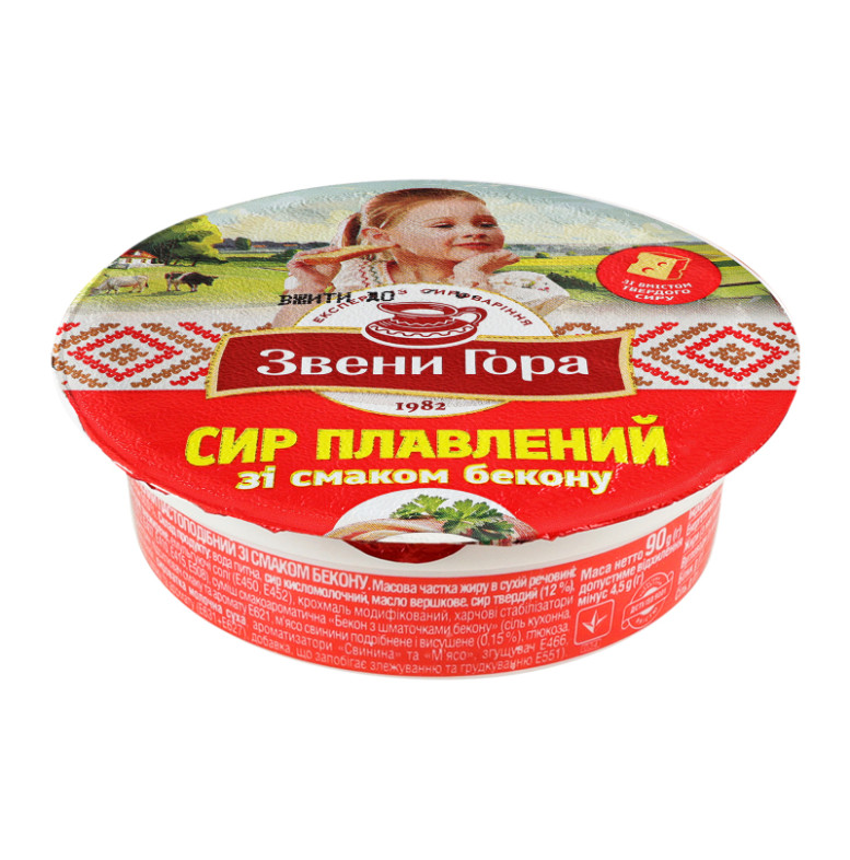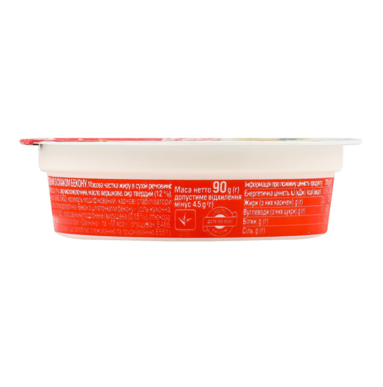 Склад: Вода питна, сир кисломолочний, масло вершкове, сир твердий (12%), молоко сухе знежирене емульгуючі солі (Е450, Е452), крохмаль модифікований, харчові стабілізатори (Е407а, Е412, Е407, Е410, Е415, Е508), суміш смакоароматична "Бекон з шматочками бекону" (сіль кухонна, мальтодекстрин, підсилювач смаку та аромату Е621, м'ясо свинини подрібнене і висушене (0.15%), глюкоза, цукор мелений, сироватка молочна суха, ароматизатори "Свинина" та "М'ясо", згущувач Е466, підсилювачі смаку та аромату (Е631 + Е627), добавка що запобігає злежуванню та грудкуванню Е551)