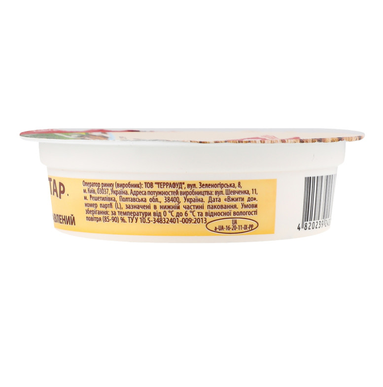 Склад: Сир, вода питна, масло вершкове, сир кисломолочний, сироватка молочна суха, емульгуючі солі (трифосфати, поліфосфати, дифосфати, фосфат натрію), стабілізатори (тари камедь, ксантанова камедь, крохмаль), сіль кухонна, консервант сорбінова кислота
