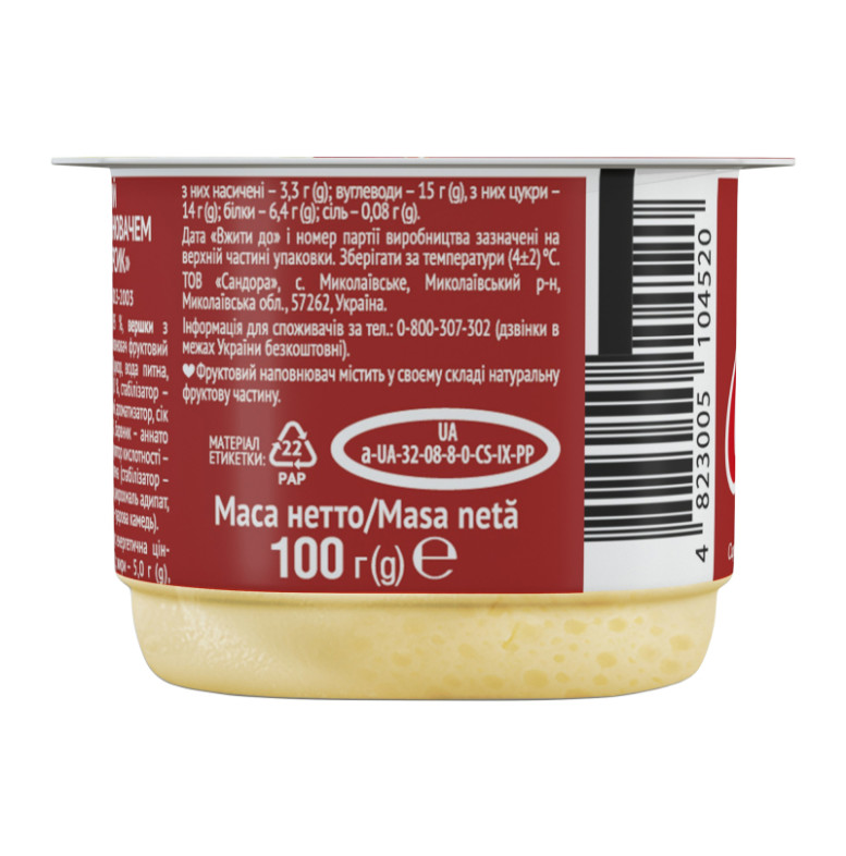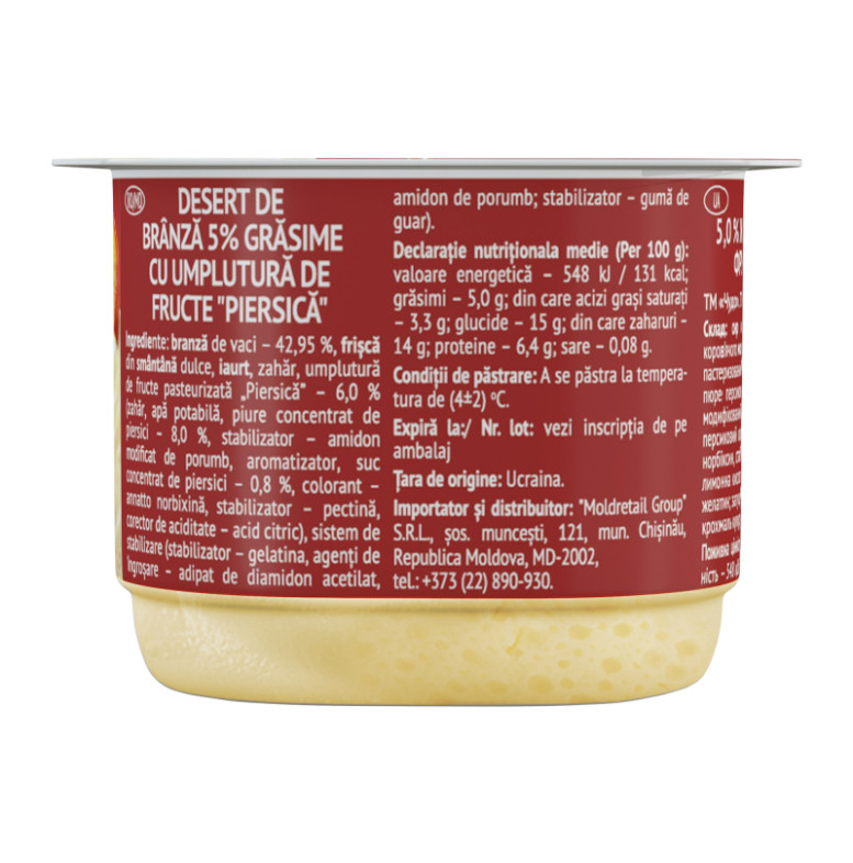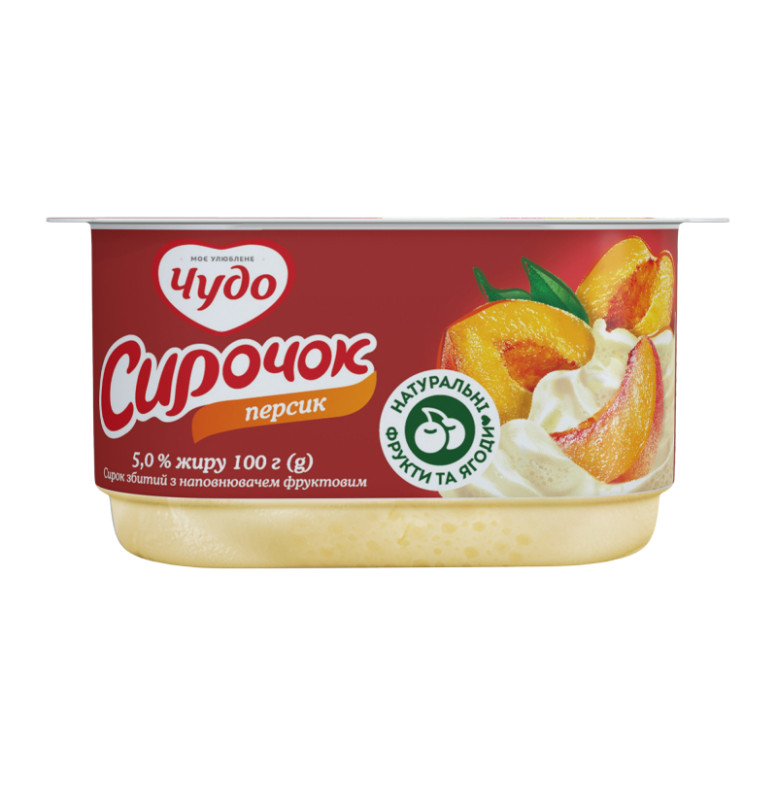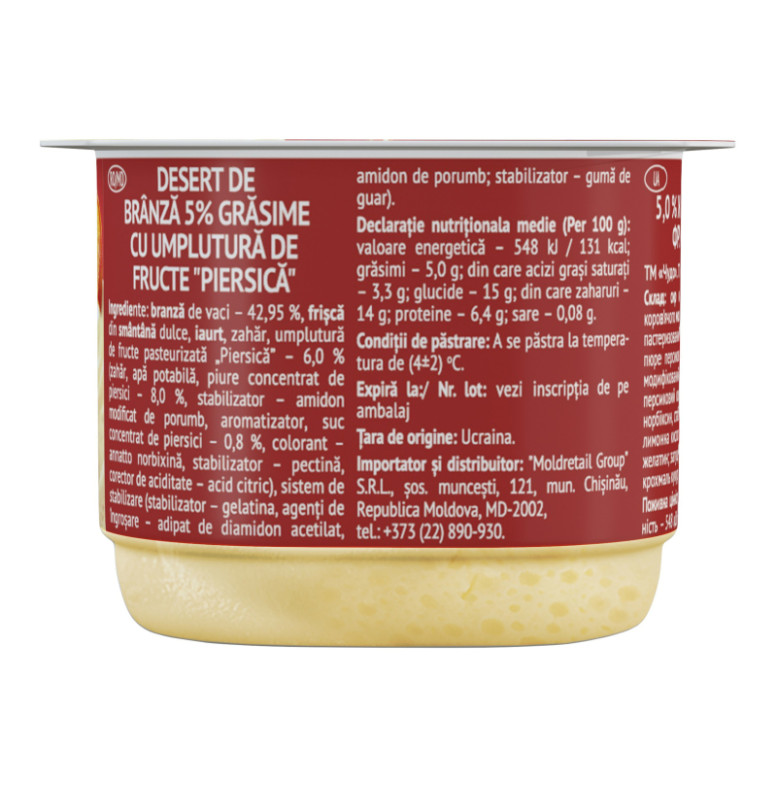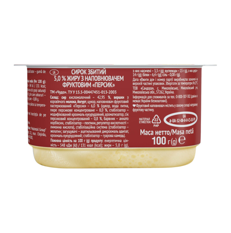 Склад: Сир кисломолочний - 42.95%, вершки з коров'ячого молока, йогурт, цукор, наповнювач фруктовий пастеризований "Персик" - 6% (цукор, вода питна, пюре персикове концентроване - 8%, стабілізатор - модифікований крохмаль кукурудзяний, ароматизатор, сік персиковий концентрований - 0.8%, барвник - аннато норбіксин, стабілізатор - пектини, регулятор кислотності - лимонна кислота), стабілізаційна система (стабілізатор - желатин, загущувачі - ацетильований дикрохмаль адипат, крохмаль кукурудзяний, стабілізатор - гуарова камедь)