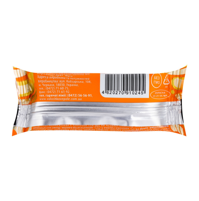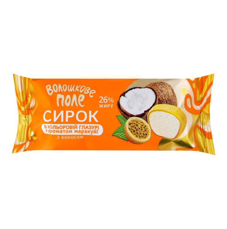 Склад: Сир кисломолочний 32.4%, глазур кондитерська кольорова з ароматом маракуї 25% (цукор, жир рослинний (пальмоядрова олія повністю гідрогенізована, олія пальмоядрова), суха молочна сироватка, молоко сухе знежирене, емульгатор "соєвий лецитин", молочна кислота, ароматизатор Маракуя, барвники харчові: екстракт паприки, екстракт куркуміну, сіль кухонна), масло вершкове, цукор 19.1%, кокосова стружка 3.75%, ароматизатор ванілін