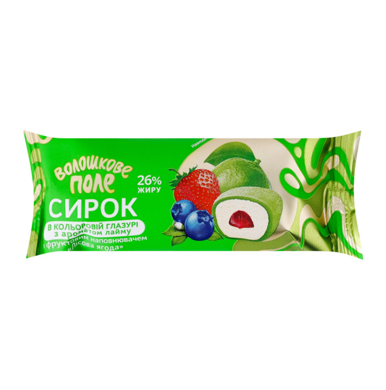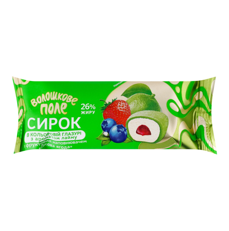 Склад: Сир кисломолочний 32.6%, глазур кондитерська кольорова з ароматом лайму 25% (цукор, жир рослинний (пальмоядрова олія повністю гідрогенізована, олія пальмоядрова), суха молочна сироватка, молоко сухе знежирене, емульгатор "соєвий лецитин", молочна кислота, ароматизатор Лайм, барвники харчові: спіруліна, екстракт куркуміну, сіль кухонна), масло вершкове, цукор 17.7%, фруктовий наповнювач "Лісова ягода" 5.5% (цукор, вода питна, малина 10%, стабілізатор модифікований крохмаль кукурудзяний, пюре ожинове 5%, бузина 5%, барвник антоціан, стабілізатори пектини, регулятор кислотності лимонна кислота, ароматизатор лісових ягід, регулятор кислотності цитрат натрію, натуральний ароматизатор "Малина", ароматизатор "Ожина", барвники карміни, цитрат кальцію), ароматизатор ванілін