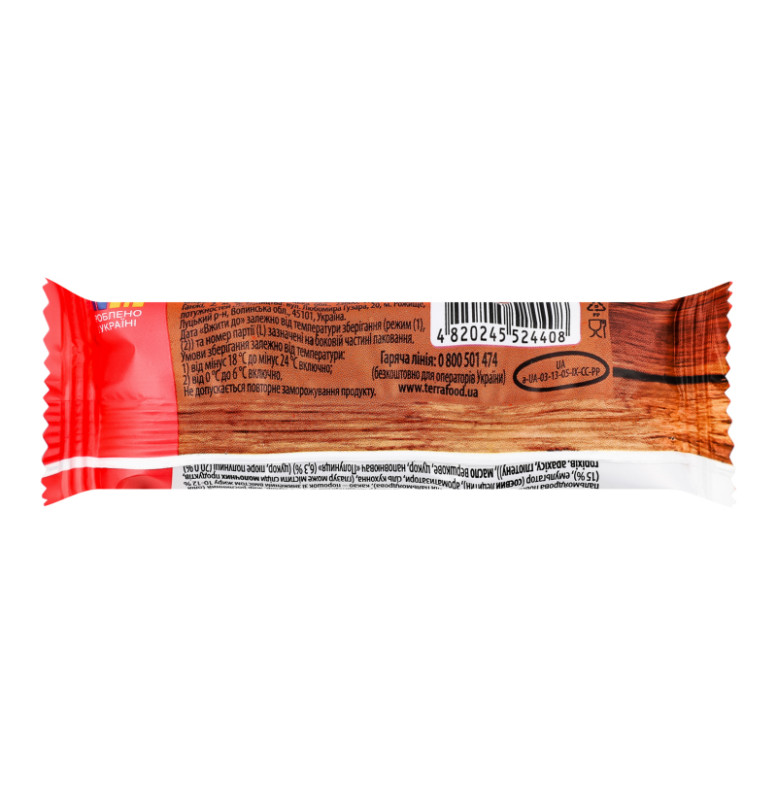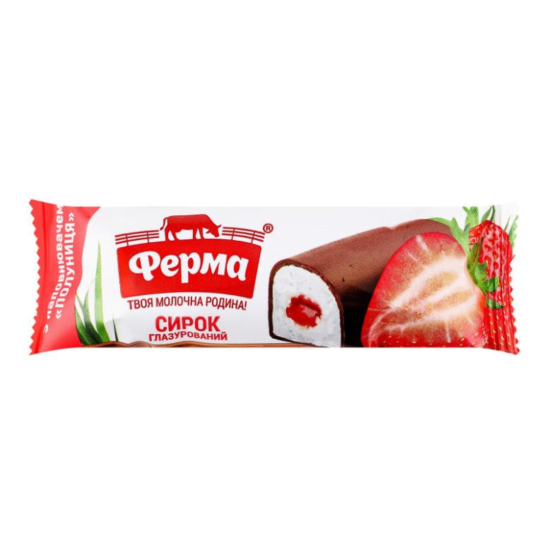 Склад: Сир кисломолочний (38.4%), глазур кондитерська (20%) (цукор, жир рослинний (олія пальмоядрова (мікс) повністю гідрогенізована), какао - порошок зі зниженим вмістом жиру 10-12%, емульгатор (соєвий лецитин), ароматизатори, сіль кухонна, (глазур може містити сліди молочних продуктів, горіхів, арахісу, глютену)), цукор, масло вершкове, наповнювач фруктовий пастеризований "Полуниця" (10%) (цукор, сік полуничний відновлений (22.4%), пюре полуничне (17.4%), вода питна, стабілізатори та загущувачі (крохмаль кукурудзяний, камедь ріжкового дерева, пектини), ароматизатори, регулятор кислотності лимонна кислота, барвники (антоціани, карміни)), маслянка суха, ароматизатор