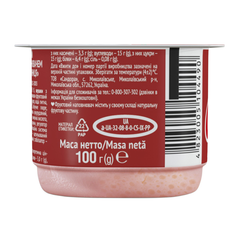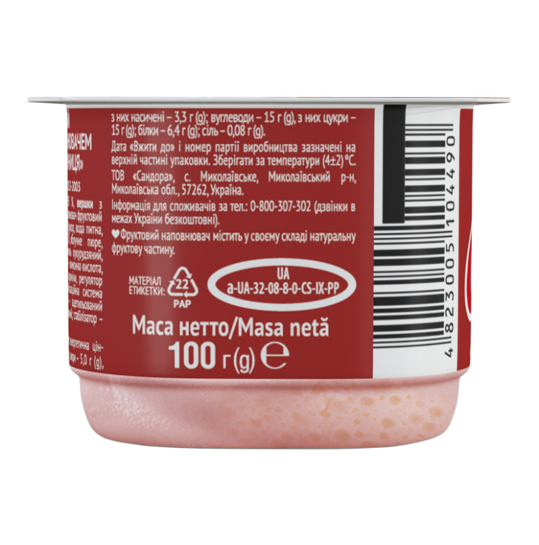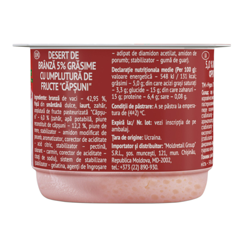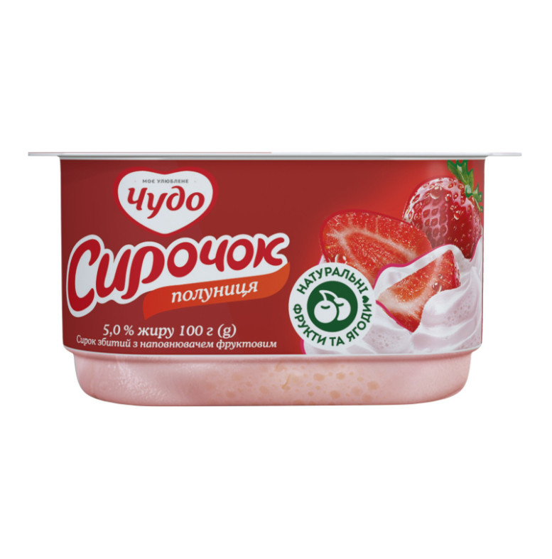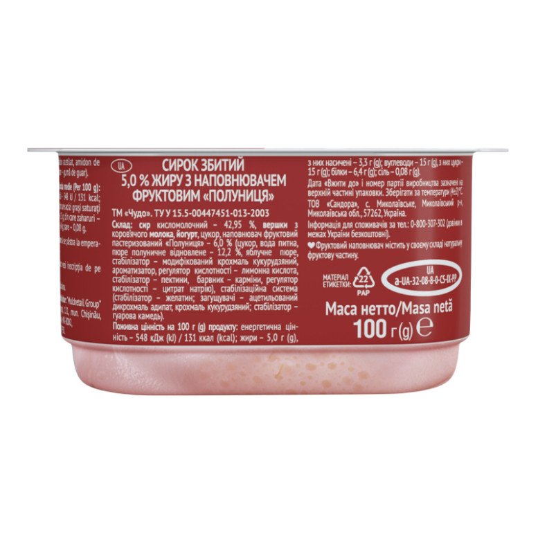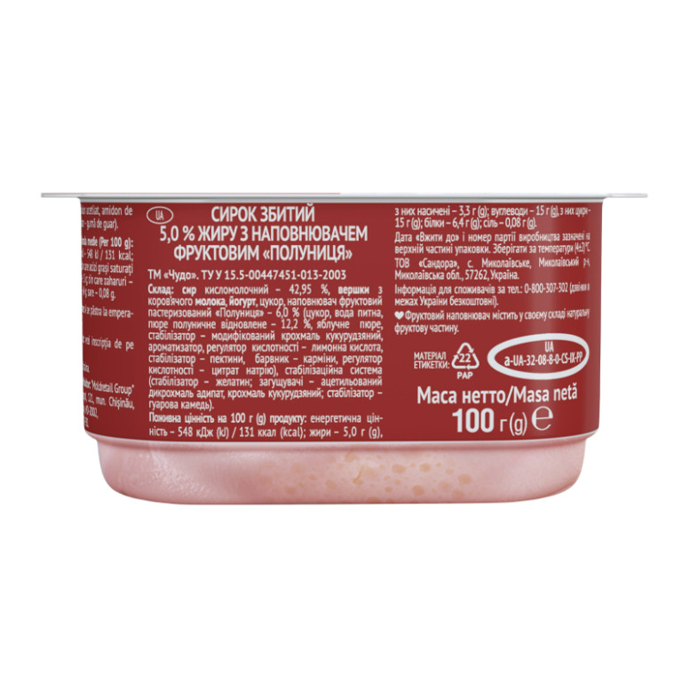 Склад: Сир кисломолочний - 42.95%, вершки з коров'ячого молока, йогурт, цукор, наповнювач фруктовий пастеризований "Полуниця" - 6% (цукор, вода питна, пюре полуничне відновлене - 12.2%, яблучне пюре, стабілізатор - модифікований крохмаль кукурудзяний, ароматизатор, регулятор кислотності - лимонна кислота, стабілізатор - пектини, барвник - карміни, регулятор кислотності - цитрат натрію), стабілізаційна система (стабілізатор - желатин, загущувачі - ацетильований дикрохмаль адипат, крохмаль кукурудзяний, стабілізатор - гуарова камедь)