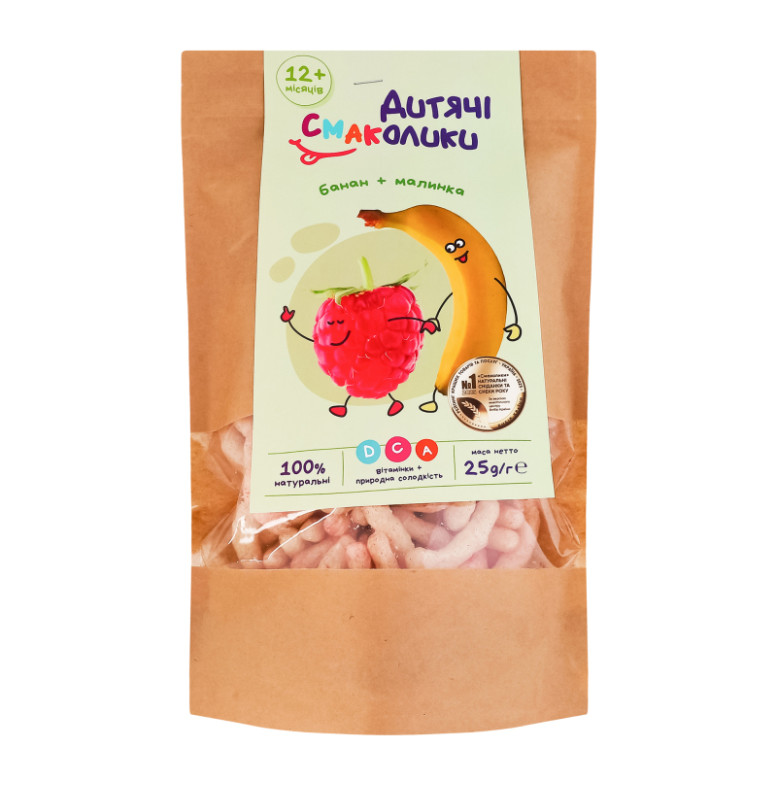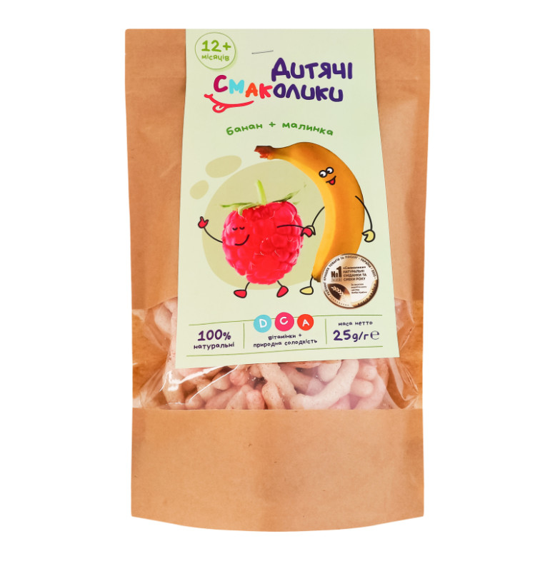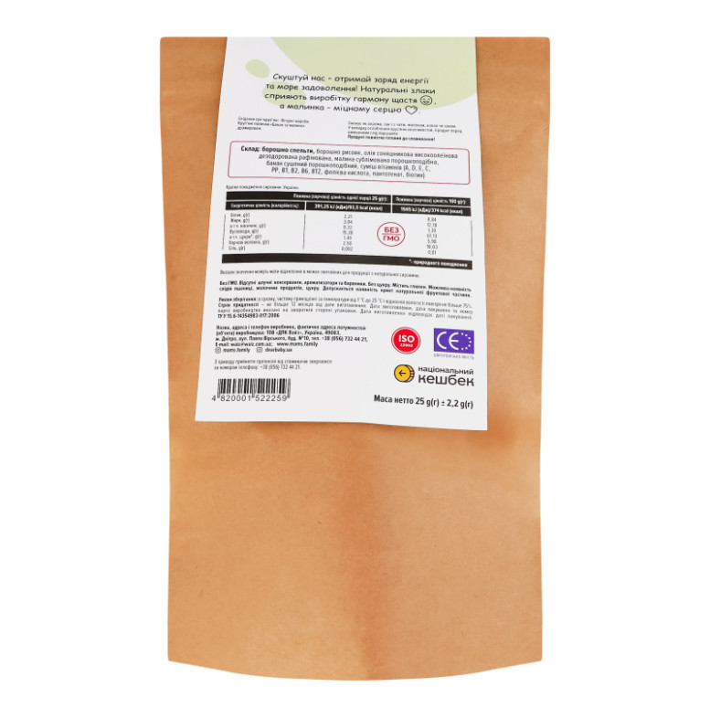 Склад: Борошно спельти, борошно рисове, олія соняшникова високоолеїнова дезодорована рафінована, малина сублімована порошкоподібна, банан сушений порошкоподібний, суміш вітамінів (A, D, E, C, PP, B1, B2, B6, B12, фолієва кислота, пантотенат, біотин)