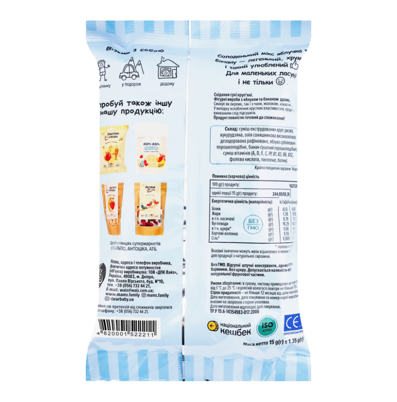 Склад: Суміш екструдованих круп: рисова, кукурудзяна, олія соняшникова високоолеїнова дезодорована рафінована, яблуко сублімоване порошкоподібне, банан сушений порошкоподібний, суміш вітамінів (A, D, E, C, PP, B1, B2, B6, B12, фолієва кислота, пантотенат, біотин)