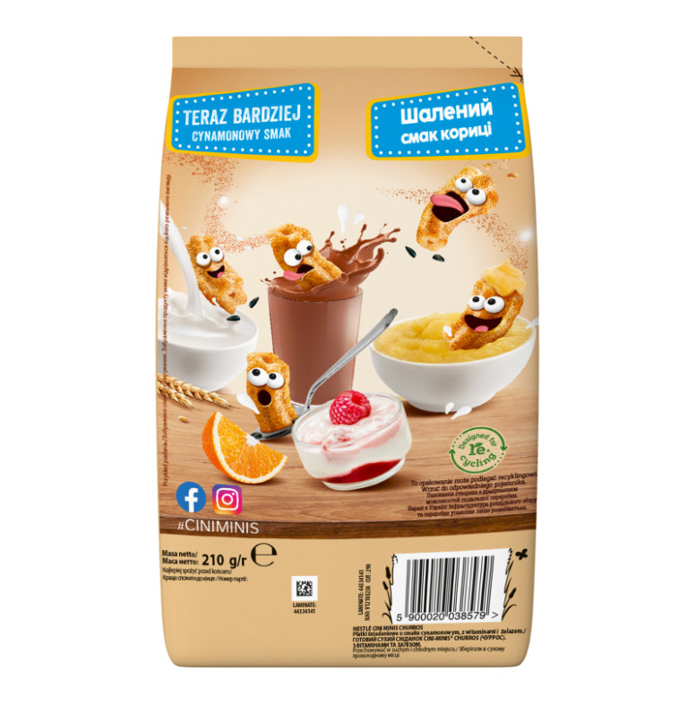 Склад: Борошно з цільнозернової пшениці 42.6% (містить глютен), крупа кукурудзяна 32.6%, цукор, олія соняшникова, наповнювач (карбонат кальцію), сіль кухонна, кориця 0.4%, натуральні ароматизатори, антиоксидант (екстракт токоферолів), барвник (каротини), залізо, ніацин (вітамін В3), фолієва кислота (вітамін В9), вітамін В6, тіамін (вітамін В1), рибофлавін (вітамін В2)