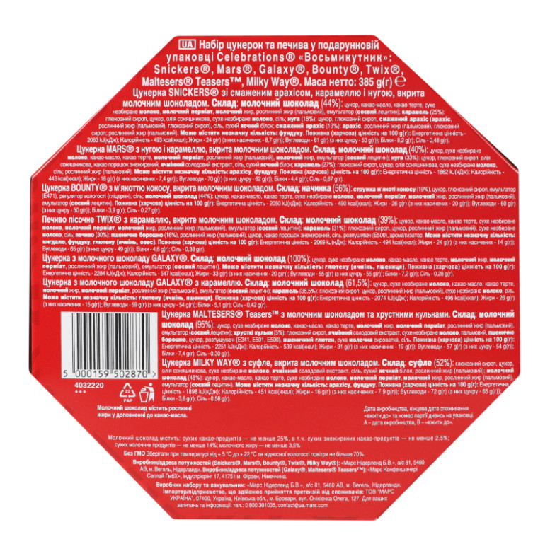 | Склад (укр.) | Snickers зі смаженим арахісом, карамеллю і нугою, вкрита молочним шоколадом: молочний шоколад (44%), цукор, какао-масло, какао терте, сухе незбиране молоко, молочний перміат, молочний жир, рослинний жир (пальмовий), емульгатор (соєвий лецитин), карамель (25%), глюкозний сироп, цукор, олія соняшникова, сухе незбиране молоко, сіль, нуга (18%), цукор, глюкозний сироп, смажений арахіс (арахіс, рослинний жир (пальмовий), глюкозний сироп), сіль, сухий яєчний білок, смажений арахіс (13%), арахіс, рослинний жир (пальмовий), глюкозный сироп, рослинний жир (пальмовий). Mars з нугою і карамеллю, вкрита молочним шоколадом: молочний шоколад (40%): цукор, сухе незбиране молоко, какао-масло, какао терте, молочний перміат, рослинний жир (пальмовий), молочний жир, емульгатор (соєвий лецитин), нуга (33%): цукор, глюкозний сироп, олія соняшникова, какао-порошок знежирений, ячмінний солодовий екстракт, сіль, сухий яєчний білок, карамель (27%): глюкозний сироп, цукор, олія соняшникова, сухе незбиране молоко, сіль, рослинний жир (пальмовий). Bounty з м'якоттю кокосу, вкрита молочним шоколадом: начинка (56%): стружка м'якоті кокосу (19%), цукор, глюкозний сироп, емульгатор (Е471), регулятор вологості (гліцерин), сіль, молочний шоколад (44%): цукор, какао-масло, какао терте, сухе незбиране молоко, молочний перміат, молочний жир, рослинний жир (пальмовий), емульгатор (соєвий лецитин). Печиво пісочне Twix з карамеллю, вкрите молочним шоколадом: молочний шоколад (39%): цукор, какао-масло, какао терте, сухе незбиране молоко, молочний перміат, молочний жир, рослинний жир (пальмовий), емульгатор (соєвий лецитин), карамель (31%): глюкозний сироп, цукор, рослинний жир (пальмовий), сухе незбиране молоко, сіль, печиво (30%): пшеничне борошно (16%), рослинний жир (пальмовий), цукор, какао-порошок знежирений, сіль, розпушувач (Е500), ароматизатор. Цукерка з молочного шоколаду Galaxy: молочний шоколад (100%): цукор, сухе незбиране молоко, какао-масло, какао терте, молочний жир, молочний перміат, рослинний жир (пальмовий), емульгатор (соєвий лецитин). Цукерка з молочного шоколаду Galaxy з карамеллю: молочний шоколад (61.5%): цукор, сухе незбиране молоко, какао-масло, какао терте, молочний жир, молочний перміат, рослинний жир (пальмовий), емульгатор (соєвий лецитин), карамель (38.5%): глюкозний сироп, цукор, рослинний жир (пальмовий), сухе незбиране молоко, сіль. Цукерка Maltesers Teasers з молочним шоколадом та хрусткими кульками: молочний шоколад (95%): цукор, сухе незбиране молоко, какао-масло, какао терте, молочний жир, молочний перміат, рослинний жир (пальмовий), емульгатор (соєвий лецитин), хрусткі кульки (5%): глюкозний сироп, ячмінний солодовий екстракт, сухе незбиране молоко, пальмовий, пшеничне борошно, цукор, розпушувачі (Е341, Е501, Е500), пшеничний глютен, суха молочна сироватка, сіль. Цукерка Milky way з суфле, вкрита молочним шоколадом: суфле (52%): глюкозний сироп, цукор, олія соняшникова, сухе незбиране молоко, ячмінний солодовий екстракт, сіль, сухий яєчний білок, рослинний жир (пальмовий), молочний шоколад (48%): цукор, какао-масло, какао терте, сухе незбиране молоко, молочний перміат, молочний жир, рослинний жир (пальмовий), емульгатор (соєвий лецитин) |
