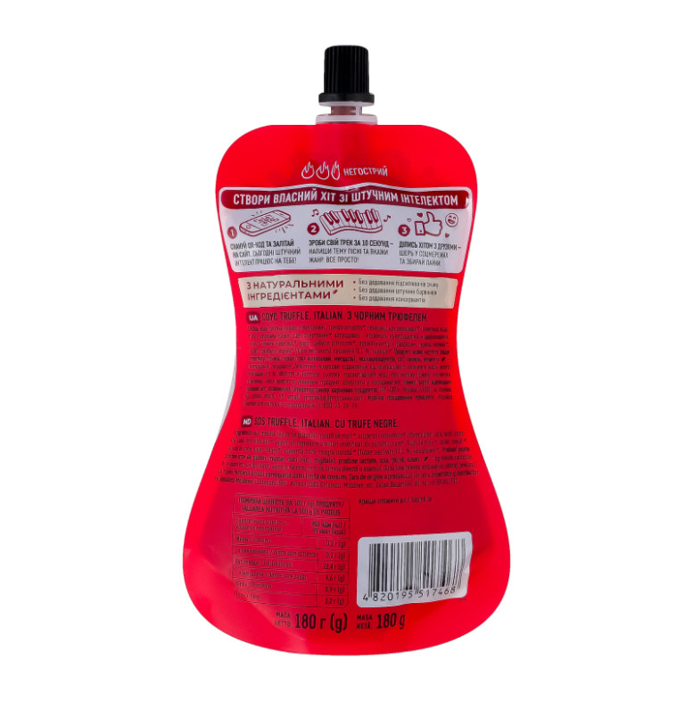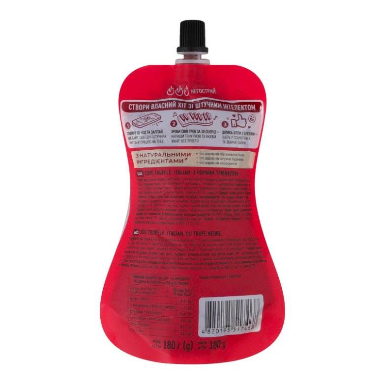 Склад (укр.) | Вода, патока (сироп глюкозний), томатна паста, печериці консервовані (печериці, вода, сіль), цукровий сироп, оцет спиртовий, загущувач - крохмаль кукурудзяний модифікований, сіль, томати пластівці, цукор, цибуля ріпчаста, ароматизатор "Трюфель", перець чорний, гриб трюфель чорний (Tuber aestivum) сушений 0.1%, кориця |